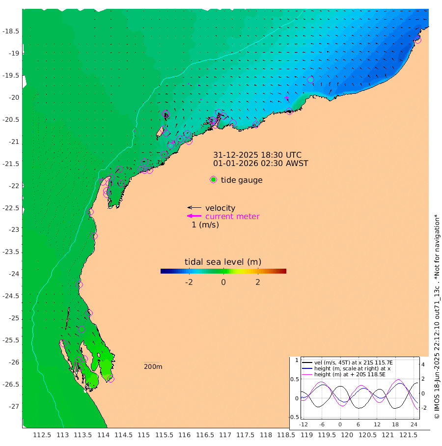 4cm/s 123T +12cm/s rms + 5cm/s -173T. NWSBAR 206m 6cm/s -138T +22cm/s rms + 10cm/s -148T. TAN100 109m 2cm/s -94T +11cm/s rms + 8cm/s -129T. PIL200 208m 7cm/s -82T +13cm/s rms + 7cm/s -137T. PIL100 105m 9cm/s -81T +12cm/s rms + 2cm/s -92T. PIL050 55m 6cm/s -141T +18cm/s rms + 4cm/s -149T. NRSNIN 61m 13cm/s -74T +6cm/s rms + 3cm/s 112T. NW Shelf M6 65m -39cm Withnell Point -17cm Denham -12cm Shark Bay (Inr Bn) -17cm Shark Bay 1cm Useless Loop 27cm Hamelin Pool -61cm Carnarvon -52cm Cape Cuvier -52cm Coral Bay -56cm Norwegian Bay -83cm Badjirrajirra -56cm Tantabiddi -68cm Point Murat -76cm Exmouth -84cm Learmonth -73cm Y Island -63cm North Muiron Island -72cm Roller -74cm Ashburton North -78cm Onslow (Beadon Creek) -76cm Thevenard Island -76cm Large Island -115cm North Sandy Island -95cm Barrow Island (Wapet Landing) -111cm Barrow Island (Tanker Mooring) -122cm Withnell Bay -92cm Trimouille Island -80cm North West Island -86cm Fortescue Road -119cm Steamboat Island -104cm Sholl Island -121cm Fairway Beacon -124cm Mawby Island -123cm Dampier (King Bay) -135cm Cape Legendre -130cm Hauy Island -143cm Port Walcott (Cape Lambert) -156cm Depuch Island -167cm Port Hedland -141cm Bedout Island -215cm Lagrange Bay