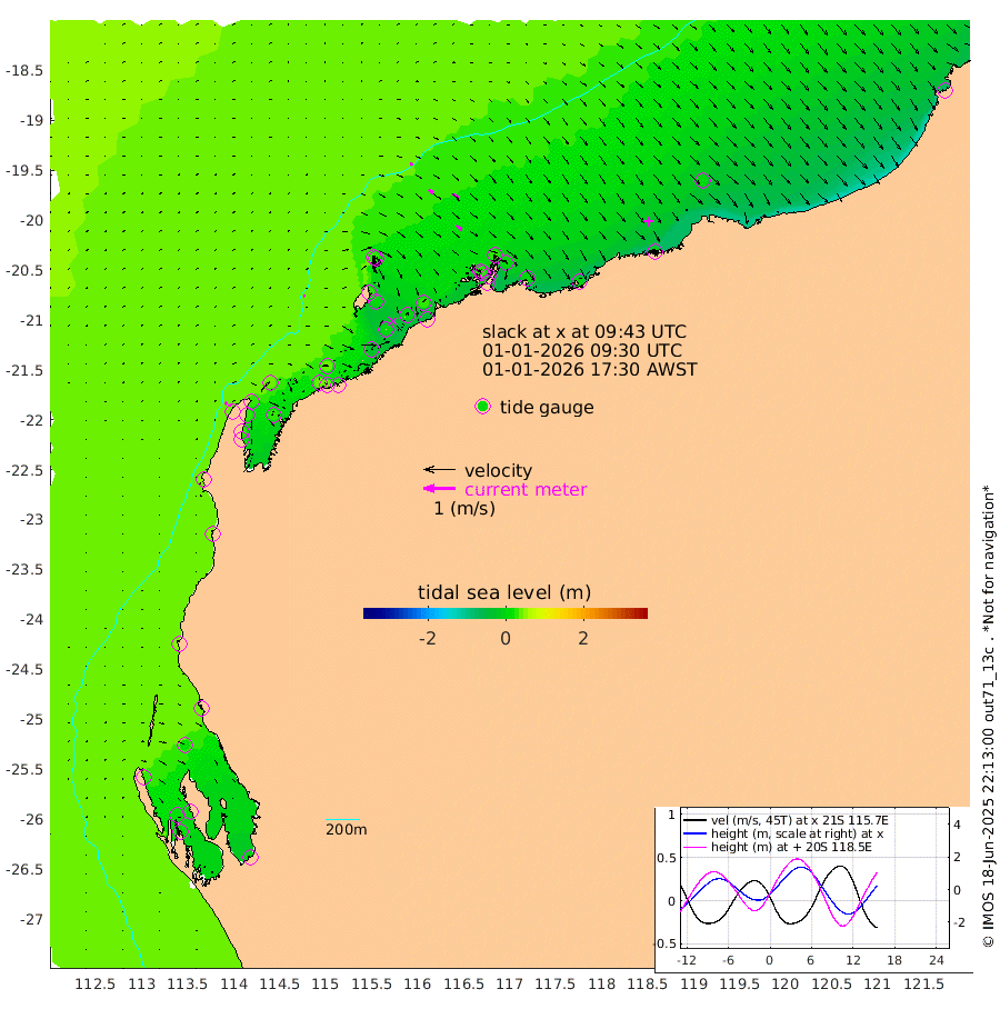 6cm/s 81T +12cm/s rms + 5cm/s -173T. NWSBAR 206m 8cm/s 39T +22cm/s rms + 10cm/s -148T. TAN100 109m 10cm/s 103T +11cm/s rms + 8cm/s -129T. PIL200 208m 19cm/s 124T +13cm/s rms + 7cm/s -137T. PIL100 105m 22cm/s 126T +12cm/s rms + 2cm/s -92T. PIL050 55m 8cm/s 47T +18cm/s rms + 4cm/s -149T. NRSNIN 61m 19cm/s 126T +6cm/s rms + 3cm/s 112T. NW Shelf M6 65m 31cm Withnell Point 21cm Denham 19cm Shark Bay (Inr Bn) 22cm Shark Bay 17cm Useless Loop -9cm Hamelin Pool 40cm Carnarvon 45cm Cape Cuvier 46cm Coral Bay 46cm Norwegian Bay 26cm Badjirrajirra 42cm Tantabiddi 32cm Point Murat 27cm Exmouth 21cm Learmonth 33cm Y Island 39cm North Muiron Island 36cm Roller 37cm Ashburton North 33cm Onslow (Beadon Creek) 37cm Thevenard Island -24cm Large Island 3cm North Sandy Island 25cm Barrow Island (Wapet Landing) 1cm Barrow Island (Tanker Mooring) 22cm Withnell Bay 21cm Trimouille Island 31cm North West Island -38cm Fortescue Road 23cm Steamboat Island 8cm Sholl Island 20cm Fairway Beacon 23cm Mawby Island 21cm Dampier (King Bay) 30cm Cape Legendre 2cm Hauy Island 8cm Port Walcott (Cape Lambert) -9cm Depuch Island -2cm Port Hedland 1cm Bedout Island -73cm Lagrange Bay