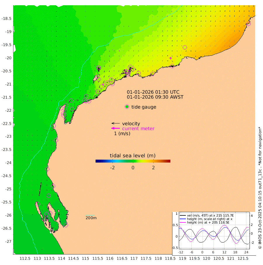 5cm/s -56T +12cm/s rms + 5cm/s -173T. NWSBAR 206m 1cm/s 78T +22cm/s rms + 10cm/s -148T. TAN100 109m 0cm/s -18T +11cm/s rms + 8cm/s -129T. PIL200 208m 1cm/s 14T +13cm/s rms + 7cm/s -137T. PIL100 105m 2cm/s 11T +12cm/s rms + 2cm/s -92T. PIL050 55m 1cm/s 36T +18cm/s rms + 4cm/s -149T. NRSNIN 61m 4cm/s 111T +6cm/s rms + 3cm/s 112T. NW Shelf M6 65m -12cm Withnell Point -31cm Denham -32cm Shark Bay (Inr Bn) -31cm Shark Bay -42cm Useless Loop -17cm Hamelin Pool 1cm Carnarvon -1cm Cape Cuvier -2cm Coral Bay 2cm Norwegian Bay 25cm Badjirrajirra 3cm Tantabiddi 14cm Point Murat 19cm Exmouth 31cm Learmonth 16cm Y Island 8cm North Muiron Island 17cm Roller 18cm Ashburton North 21cm Onslow (Beadon Creek) 19cm Thevenard Island 47cm Large Island 61cm North Sandy Island 37cm Barrow Island (Wapet Landing) 56cm Barrow Island (Tanker Mooring) 60cm Withnell Bay 38cm Trimouille Island 24cm North West Island 66cm Fortescue Road 53cm Steamboat Island 59cm Sholl Island 60cm Fairway Beacon 62cm Mawby Island 61cm Dampier (King Bay) 65cm Cape Legendre 77cm Hauy Island 82cm Port Walcott (Cape Lambert) 96cm Depuch Island 106cm Port Hedland 88cm Bedout Island 192cm Lagrange Bay