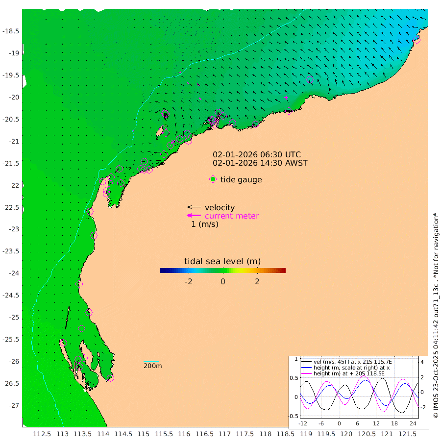 5cm/s -155T +12cm/s rms + 5cm/s -173T. NWSBAR 206m 1cm/s -97T +22cm/s rms + 10cm/s -148T. TAN100 109m 8cm/s -72T +11cm/s rms + 8cm/s -129T. PIL200 208m 13cm/s -59T +13cm/s rms + 7cm/s -137T. PIL100 105m 16cm/s -56T +12cm/s rms + 2cm/s -92T. PIL050 55m 0cm/s -77T +18cm/s rms + 4cm/s -149T. NRSNIN 61m 20cm/s -60T +6cm/s rms + 3cm/s 112T. NW Shelf M6 65m 2cm Withnell Point 0cm Denham -2cm Shark Bay (Inr Bn) -3cm Shark Bay -8cm Useless Loop -10cm Hamelin Pool 0cm Carnarvon -1cm Cape Cuvier -4cm Coral Bay -6cm Norwegian Bay -22cm Badjirrajirra -8cm Tantabiddi -14cm Point Murat -18cm Exmouth -19cm Learmonth -23cm Y Island -14cm North Muiron Island -20cm Roller -22cm Ashburton North -25cm Onslow (Beadon Creek) -24cm Thevenard Island -4cm Large Island -30cm North Sandy Island -35cm Barrow Island (Wapet Landing) -34cm Barrow Island (Tanker Mooring) -59cm Withnell Bay -27cm Trimouille Island -26cm North West Island -27cm Fortescue Road -50cm Steamboat Island -41cm Sholl Island -57cm Fairway Beacon -57cm Mawby Island -59cm Dampier (King Bay) -64cm Cape Legendre -60cm Hauy Island -73cm Port Walcott (Cape Lambert) -68cm Depuch Island -95cm Port Hedland -115cm Bedout Island -163cm Lagrange Bay