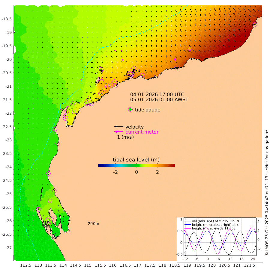 7cm/s -92T +12cm/s rms + 5cm/s -173T. NWSBAR 206m 6cm/s -134T +22cm/s rms + 10cm/s -148T. TAN100 109m 9cm/s -70T +11cm/s rms + 8cm/s -129T. PIL200 208m 18cm/s -43T +13cm/s rms + 7cm/s -137T. PIL100 105m 21cm/s -35T +12cm/s rms + 2cm/s -92T. PIL050 55m 7cm/s -129T +18cm/s rms + 4cm/s -149T. NRSNIN 61m 25cm/s -33T +6cm/s rms + 3cm/s 112T. NW Shelf M6 65m 46cm Withnell Point 57cm Denham 55cm Shark Bay (Inr Bn) 57cm Shark Bay 52cm Useless Loop -1cm Hamelin Pool 49cm Carnarvon 26cm Cape Cuvier 28cm Coral Bay 29cm Norwegian Bay 98cm Badjirrajirra 37cm Tantabiddi 69cm Point Murat 86cm Exmouth 98cm Learmonth 75cm Y Island 53cm North Muiron Island 61cm Roller 67cm Ashburton North 78cm Onslow (Beadon Creek) 71cm Thevenard Island 133cm Large Island 147cm North Sandy Island 106cm Barrow Island (Wapet Landing) 154cm Barrow Island (Tanker Mooring) 138cm Withnell Bay 96cm Trimouille Island 85cm North West Island 147cm Fortescue Road 140cm Steamboat Island 139cm Sholl Island 138cm Fairway Beacon 138cm Mawby Island 139cm Dampier (King Bay) 138cm Cape Legendre 160cm Hauy Island 178cm Port Walcott (Cape Lambert) 198cm Depuch Island 217cm Port Hedland 198cm Bedout Island 232cm Lagrange Bay