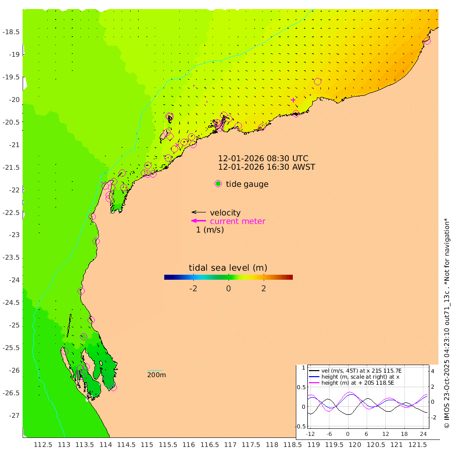 2cm/s -67T +12cm/s rms + 5cm/s -173T. NWSBAR 206m 3cm/s 36T +22cm/s rms + 10cm/s -148T. TAN100 109m 2cm/s 74T +11cm/s rms + 8cm/s -129T. PIL200 208m 4cm/s 86T +13cm/s rms + 7cm/s -137T. PIL100 105m 6cm/s 85T +12cm/s rms + 2cm/s -92T. PIL050 55m 3cm/s 42T +18cm/s rms + 4cm/s -149T. NRSNIN 61m 4cm/s 50T +6cm/s rms + 3cm/s 112T. NW Shelf M6 65m 33cm Withnell Point 26cm Denham 24cm Shark Bay (Inr Bn) 24cm Shark Bay 16cm Useless Loop -13cm Hamelin Pool 48cm Carnarvon 40cm Cape Cuvier 42cm Coral Bay 46cm Norwegian Bay 69cm Badjirrajirra 45cm Tantabiddi 56cm Point Murat 63cm Exmouth 69cm Learmonth 63cm Y Island 53cm North Muiron Island 58cm Roller 61cm Ashburton North 63cm Onslow (Beadon Creek) 62cm Thevenard Island 75cm Large Island 94cm North Sandy Island 77cm Barrow Island (Wapet Landing) 89cm Barrow Island (Tanker Mooring) 97cm Withnell Bay 73cm Trimouille Island 61cm North West Island 84cm Fortescue Road 87cm Steamboat Island 95cm Sholl Island 94cm Fairway Beacon 96cm Mawby Island 96cm Dampier (King Bay) 99cm Cape Legendre 96cm Hauy Island 113cm Port Walcott (Cape Lambert) 116cm Depuch Island 133cm Port Hedland 120cm Bedout Island 139cm Lagrange Bay