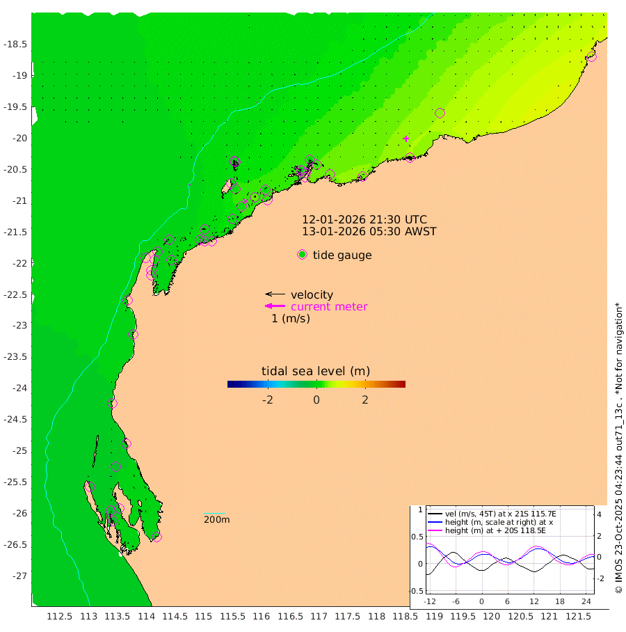 4cm/s -22T +12cm/s rms + 5cm/s -173T. NWSBAR 206m 3cm/s -157T +22cm/s rms + 10cm/s -148T. TAN100 109m 1cm/s 69T +11cm/s rms + 8cm/s -129T. PIL200 208m 0cm/s 21T +13cm/s rms + 7cm/s -137T. PIL100 105m 1cm/s -42T +12cm/s rms + 2cm/s -92T. PIL050 55m 2cm/s -142T +18cm/s rms + 4cm/s -149T. NRSNIN 61m 2cm/s -57T +6cm/s rms + 3cm/s 112T. NW Shelf M6 65m -19cm Withnell Point -25cm Denham -25cm Shark Bay (Inr Bn) -23cm Shark Bay -26cm Useless Loop -4cm Hamelin Pool -15cm Carnarvon -14cm Cape Cuvier -13cm Coral Bay -9cm Norwegian Bay 4cm Badjirrajirra -9cm Tantabiddi -3cm Point Murat 2cm Exmouth 5cm Learmonth 2cm Y Island -5cm North Muiron Island 0cm Roller 0cm Ashburton North 1cm Onslow (Beadon Creek) 1cm Thevenard Island 16cm Large Island 21cm North Sandy Island 11cm Barrow Island (Wapet Landing) 19cm Barrow Island (Tanker Mooring) 23cm Withnell Bay 7cm Trimouille Island 4cm North West Island 29cm Fortescue Road 19cm Steamboat Island 40cm Sholl Island 22cm Fairway Beacon 21cm Mawby Island 23cm Dampier (King Bay) 19cm Cape Legendre 34cm Hauy Island 35cm Port Walcott (Cape Lambert) 35cm Depuch Island 49cm Port Hedland 47cm Bedout Island 63cm Lagrange Bay