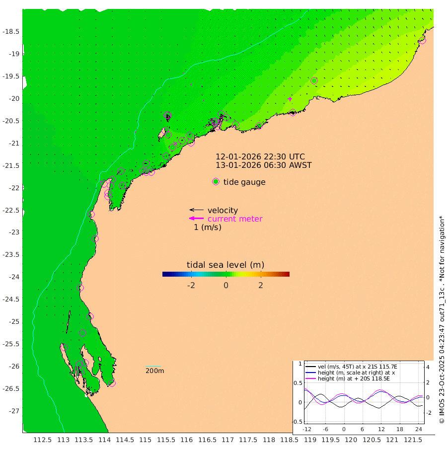 4cm/s -49T +12cm/s rms + 5cm/s -173T. NWSBAR 206m 4cm/s -155T +22cm/s rms + 10cm/s -148T. TAN100 109m 2cm/s -62T +11cm/s rms + 8cm/s -129T. PIL200 208m 4cm/s -47T +13cm/s rms + 7cm/s -137T. PIL100 105m 5cm/s -49T +12cm/s rms + 2cm/s -92T. PIL050 55m 3cm/s -138T +18cm/s rms + 4cm/s -149T. NRSNIN 61m 5cm/s -69T +6cm/s rms + 3cm/s 112T. NW Shelf M6 65m -18cm Withnell Point -24cm Denham -25cm Shark Bay (Inr Bn) -23cm Shark Bay -27cm Useless Loop -6cm Hamelin Pool -14cm Carnarvon -15cm Cape Cuvier -15cm Coral Bay -11cm Norwegian Bay 1cm Badjirrajirra -12cm Tantabiddi -5cm Point Murat -1cm Exmouth 4cm Learmonth -4cm Y Island -9cm North Muiron Island -6cm Roller -5cm Ashburton North -3cm Onslow (Beadon Creek) -4cm Thevenard Island 15cm Large Island 17cm North Sandy Island 5cm Barrow Island (Wapet Landing) 16cm Barrow Island (Tanker Mooring) 13cm Withnell Bay 5cm Trimouille Island -2cm North West Island 27cm Fortescue Road 8cm Steamboat Island 30cm Sholl Island 13cm Fairway Beacon 11cm Mawby Island 14cm Dampier (King Bay) 12cm Cape Legendre 25cm Hauy Island 24cm Port Walcott (Cape Lambert) 22cm Depuch Island 34cm Port Hedland 24cm Bedout Island 48cm Lagrange Bay