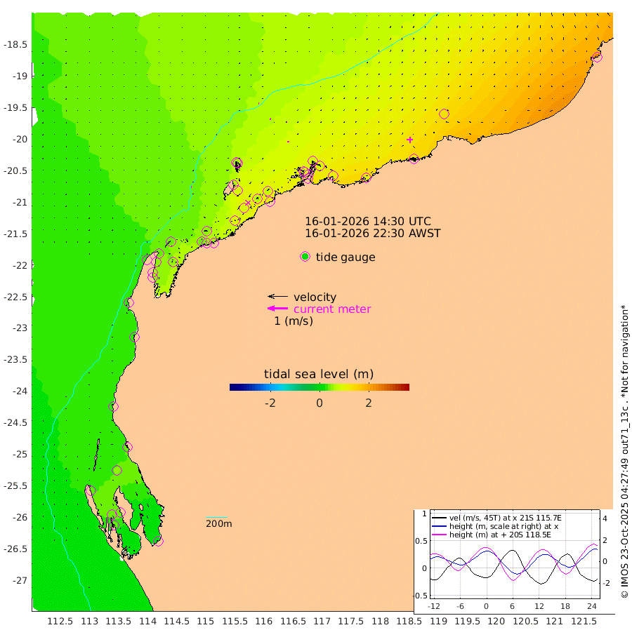 3cm/s -90T +12cm/s rms + 5cm/s -173T. NWSBAR 206m 1cm/s -125T +22cm/s rms + 10cm/s -148T. TAN100 109m 3cm/s -80T +11cm/s rms + 8cm/s -129T. PIL200 208m 5cm/s -31T +13cm/s rms + 7cm/s -137T. PIL100 105m 5cm/s -9T +12cm/s rms + 2cm/s -92T. PIL050 55m 1cm/s -121T +18cm/s rms + 4cm/s -149T. NRSNIN 61m 4cm/s 5T +6cm/s rms + 3cm/s 112T. NW Shelf M6 65m 35cm Withnell Point 44cm Denham 43cm Shark Bay (Inr Bn) 47cm Shark Bay 45cm Useless Loop 3cm Hamelin Pool 36cm Carnarvon 23cm Cape Cuvier 26cm Coral Bay 25cm Norwegian Bay 57cm Badjirrajirra 30cm Tantabiddi 44cm Point Murat 52cm Exmouth 56cm Learmonth 49cm Y Island 38cm North Muiron Island 42cm Roller 46cm Ashburton North 50cm Onslow (Beadon Creek) 48cm Thevenard Island 99cm Large Island 81cm North Sandy Island 65cm Barrow Island (Wapet Landing) 85cm Barrow Island (Tanker Mooring) 82cm Withnell Bay 59cm Trimouille Island 52cm North West Island 117cm Fortescue Road 70cm Steamboat Island 63cm Sholl Island 81cm Fairway Beacon 80cm Mawby Island 83cm Dampier (King Bay) 81cm Cape Legendre 87cm Hauy Island 102cm Port Walcott (Cape Lambert) 110cm Depuch Island 123cm Port Hedland 125cm Bedout Island 239cm Lagrange Bay