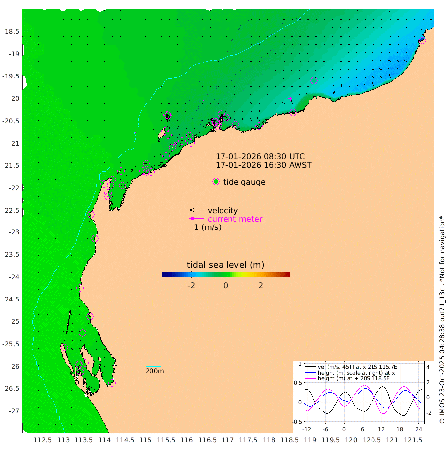 3cm/s 160T +12cm/s rms + 5cm/s -173T. NWSBAR 206m 2cm/s 33T +22cm/s rms + 10cm/s -148T. TAN100 109m 2cm/s -49T +11cm/s rms + 8cm/s -129T. PIL200 208m 2cm/s -66T +13cm/s rms + 7cm/s -137T. PIL100 105m 3cm/s -81T +12cm/s rms + 2cm/s -92T. PIL050 55m 2cm/s 44T +18cm/s rms + 4cm/s -149T. NRSNIN 61m 5cm/s -93T +6cm/s rms + 3cm/s 112T. NW Shelf M6 65m 14cm Withnell Point 13cm Denham 11cm Shark Bay (Inr Bn) 13cm Shark Bay 9cm Useless Loop -6cm Hamelin Pool 15cm Carnarvon 16cm Cape Cuvier 14cm Coral Bay 13cm Norwegian Bay -10cm Badjirrajirra 9cm Tantabiddi 0cm Point Murat -6cm Exmouth -16cm Learmonth -6cm Y Island 3cm North Muiron Island -4cm Roller -6cm Ashburton North -9cm Onslow (Beadon Creek) -7cm Thevenard Island -61cm Large Island -37cm North Sandy Island -23cm Barrow Island (Wapet Landing) -37cm Barrow Island (Tanker Mooring) -45cm Withnell Bay -17cm Trimouille Island -13cm North West Island -90cm Fortescue Road -27cm Steamboat Island -33cm Sholl Island -44cm Fairway Beacon -45cm Mawby Island -46cm Dampier (King Bay) -41cm Cape Legendre -54cm Hauy Island -65cm Port Walcott (Cape Lambert) -74cm Depuch Island -90cm Port Hedland -92cm Bedout Island -252cm Lagrange Bay