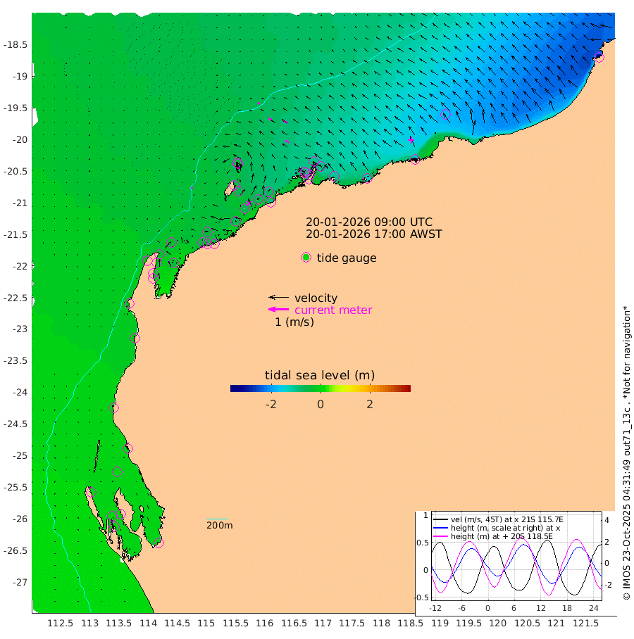 6cm/s -160T +12cm/s rms + 5cm/s -173T. NWSBAR 206m 3cm/s -136T +22cm/s rms + 10cm/s -148T. TAN100 109m 12cm/s -73T +11cm/s rms + 8cm/s -129T. PIL200 208m 17cm/s -57T +13cm/s rms + 7cm/s -137T. PIL100 105m 21cm/s -57T +12cm/s rms + 2cm/s -92T. PIL050 55m 3cm/s -126T +18cm/s rms + 4cm/s -149T. NRSNIN 61m 21cm/s -63T +6cm/s rms + 3cm/s 112T. NW Shelf M6 65m 1cm Withnell Point 9cm Denham 5cm Shark Bay (Inr Bn) 7cm Shark Bay 7cm Useless Loop -3cm Hamelin Pool -6cm Carnarvon -8cm Cape Cuvier -12cm Coral Bay -13cm Norwegian Bay -33cm Badjirrajirra -18cm Tantabiddi -24cm Point Murat -29cm Exmouth -37cm Learmonth -37cm Y Island -26cm North Muiron Island -36cm Roller -36cm Ashburton North -39cm Onslow (Beadon Creek) -38cm Thevenard Island -70cm Large Island -62cm North Sandy Island -54cm Barrow Island (Wapet Landing) -59cm Barrow Island (Tanker Mooring) -92cm Withnell Bay -53cm Trimouille Island -43cm North West Island -93cm Fortescue Road -77cm Steamboat Island -65cm Sholl Island -88cm Fairway Beacon -90cm Mawby Island -91cm Dampier (King Bay) -90cm Cape Legendre -94cm Hauy Island -112cm Port Walcott (Cape Lambert) -128cm Depuch Island -147cm Port Hedland -159cm Bedout Island -326cm Lagrange Bay