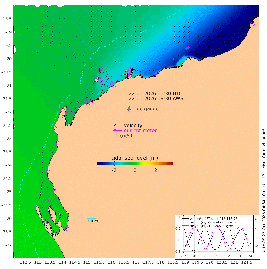 5cm/s 128T +12cm/s rms + 5cm/s -173T. NWSBAR 206m 1cm/s 34T +22cm/s rms + 10cm/s -148T. TAN100 109m 3cm/s -85T +11cm/s rms + 8cm/s -129T. PIL200 208m 3cm/s -110T +13cm/s rms + 7cm/s -137T. PIL100 105m 5cm/s -122T +12cm/s rms + 2cm/s -92T. PIL050 55m 1cm/s 44T +18cm/s rms + 4cm/s -149T. NRSNIN 61m 7cm/s -177T +6cm/s rms + 3cm/s 112T. NW Shelf M6 65m -11cm Withnell Point -2cm Denham -4cm Shark Bay (Inr Bn) 0cm Shark Bay 7cm Useless Loop 9cm Hamelin Pool -25cm Carnarvon -15cm Cape Cuvier -18cm Coral Bay -23cm Norwegian Bay -76cm Badjirrajirra -29cm Tantabiddi -51cm Point Murat -66cm Exmouth -83cm Learmonth -64cm Y Island -44cm North Muiron Island -57cm Roller -60cm Ashburton North -68cm Onslow (Beadon Creek) -63cm Thevenard Island -128cm Large Island -136cm North Sandy Island -98cm Barrow Island (Wapet Landing) -131cm Barrow Island (Tanker Mooring) -146cm Withnell Bay -101cm Trimouille Island -74cm North West Island -147cm Fortescue Road -139cm Steamboat Island -145cm Sholl Island -142cm Fairway Beacon -143cm Mawby Island -145cm Dampier (King Bay) -142cm Cape Legendre -164cm Hauy Island -186cm Port Walcott (Cape Lambert) -216cm Depuch Island -236cm Port Hedland -221cm Bedout Island -324cm Lagrange Bay
