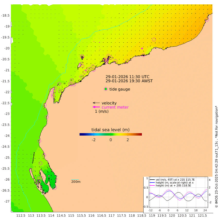 2cm/s -77T +12cm/s rms + 5cm/s -173T. NWSBAR 206m 1cm/s 34T +22cm/s rms + 10cm/s -148T. TAN100 109m 1cm/s -50T +11cm/s rms + 8cm/s -129T. PIL200 208m 3cm/s 20T +13cm/s rms + 7cm/s -137T. PIL100 105m 4cm/s 42T +12cm/s rms + 2cm/s -92T. PIL050 55m 1cm/s 9T +18cm/s rms + 4cm/s -149T. NRSNIN 61m 7cm/s 68T +6cm/s rms + 3cm/s 112T. NW Shelf M6 65m 50cm Withnell Point 52cm Denham 48cm Shark Bay (Inr Bn) 53cm Shark Bay 48cm Useless Loop -6cm Hamelin Pool 58cm Carnarvon 45cm Cape Cuvier 46cm Coral Bay 49cm Norwegian Bay 76cm Badjirrajirra 48cm Tantabiddi 62cm Point Murat 70cm Exmouth 69cm Learmonth 67cm Y Island 56cm North Muiron Island 60cm Roller 63cm Ashburton North 68cm Onslow (Beadon Creek) 65cm Thevenard Island 59cm Large Island 87cm North Sandy Island 79cm Barrow Island (Wapet Landing) 93cm Barrow Island (Tanker Mooring) 94cm Withnell Bay 70cm Trimouille Island 67cm North West Island 71cm Fortescue Road 93cm Steamboat Island 77cm Sholl Island 93cm Fairway Beacon 94cm Mawby Island 95cm Dampier (King Bay) 106cm Cape Legendre 98cm Hauy Island 109cm Port Walcott (Cape Lambert) 109cm Depuch Island 123cm Port Hedland 113cm Bedout Island 148cm Lagrange Bay