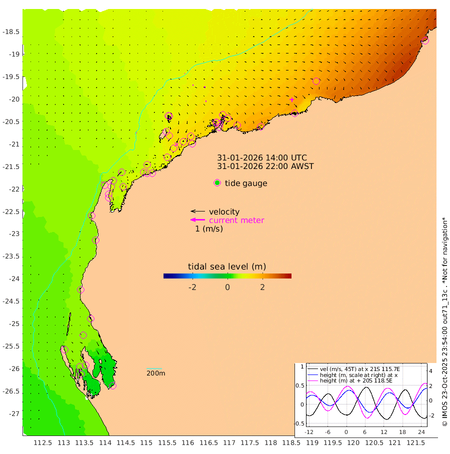 2cm/s -31T +12cm/s rms + 5cm/s -173T. NWSBAR 206m 2cm/s 33T +22cm/s rms + 10cm/s -148T. TAN100 109m 2cm/s 102T +11cm/s rms + 8cm/s -129T. PIL200 208m 4cm/s 78T +13cm/s rms + 7cm/s -137T. PIL100 105m 7cm/s 81T +12cm/s rms + 2cm/s -92T. PIL050 55m 1cm/s 28T +18cm/s rms + 4cm/s -149T. NRSNIN 61m 9cm/s 66T +6cm/s rms + 3cm/s 112T. NW Shelf M6 65m 50cm Withnell Point 51cm Denham 48cm Shark Bay (Inr Bn) 53cm Shark Bay 46cm Useless Loop -5cm Hamelin Pool 60cm Carnarvon 46cm Cape Cuvier 48cm Coral Bay 49cm Norwegian Bay 91cm Badjirrajirra 54cm Tantabiddi 72cm Point Murat 82cm Exmouth 88cm Learmonth 79cm Y Island 64cm North Muiron Island 72cm Roller 78cm Ashburton North 84cm Onslow (Beadon Creek) 81cm Thevenard Island 100cm Large Island 119cm North Sandy Island 103cm Barrow Island (Wapet Landing) 125cm Barrow Island (Tanker Mooring) 135cm Withnell Bay 91cm Trimouille Island 89cm North West Island 118cm Fortescue Road 129cm Steamboat Island 106cm Sholl Island 133cm Fairway Beacon 136cm Mawby Island 136cm Dampier (King Bay) 143cm Cape Legendre 141cm Hauy Island 161cm Port Walcott (Cape Lambert) 172cm Depuch Island 192cm Port Hedland 187cm Bedout Island 271cm Lagrange Bay
