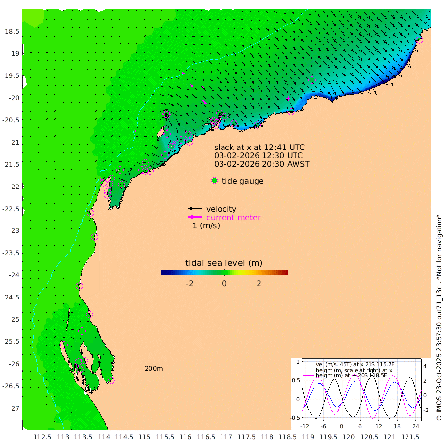 10cm/s 76T +12cm/s rms + 5cm/s -173T. NWSBAR 206m 10cm/s 41T +22cm/s rms + 10cm/s -148T. TAN100 109m 16cm/s 111T +11cm/s rms + 8cm/s -129T. PIL200 208m 28cm/s 131T +13cm/s rms + 7cm/s -137T. PIL100 105m 35cm/s 133T +12cm/s rms + 2cm/s -92T. PIL050 55m 10cm/s 47T +18cm/s rms + 4cm/s -149T. NRSNIN 61m 37cm/s 131T +6cm/s rms + 3cm/s 112T. NW Shelf M6 65m 5cm Withnell Point -4cm Denham -4cm Shark Bay (Inr Bn) 4cm Shark Bay 2cm Useless Loop 2cm Hamelin Pool 7cm Carnarvon 23cm Cape Cuvier 24cm Coral Bay 20cm Norwegian Bay -26cm Badjirrajirra 18cm Tantabiddi -6cm Point Murat -19cm Exmouth -33cm Learmonth -4cm Y Island 9cm North Muiron Island 5cm Roller 2cm Ashburton North -6cm Onslow (Beadon Creek) 1cm Thevenard Island -45cm Large Island -65cm North Sandy Island -25cm Barrow Island (Wapet Landing) -66cm Barrow Island (Tanker Mooring) -37cm Withnell Bay -32cm Trimouille Island -9cm North West Island -47cm Fortescue Road -45cm Steamboat Island -71cm Sholl Island -38cm Fairway Beacon -36cm Mawby Island -36cm Dampier (King Bay) -34cm Cape Legendre -63cm Hauy Island -63cm Port Walcott (Cape Lambert) -84cm Depuch Island -84cm Port Hedland -49cm Bedout Island 19cm Lagrange Bay