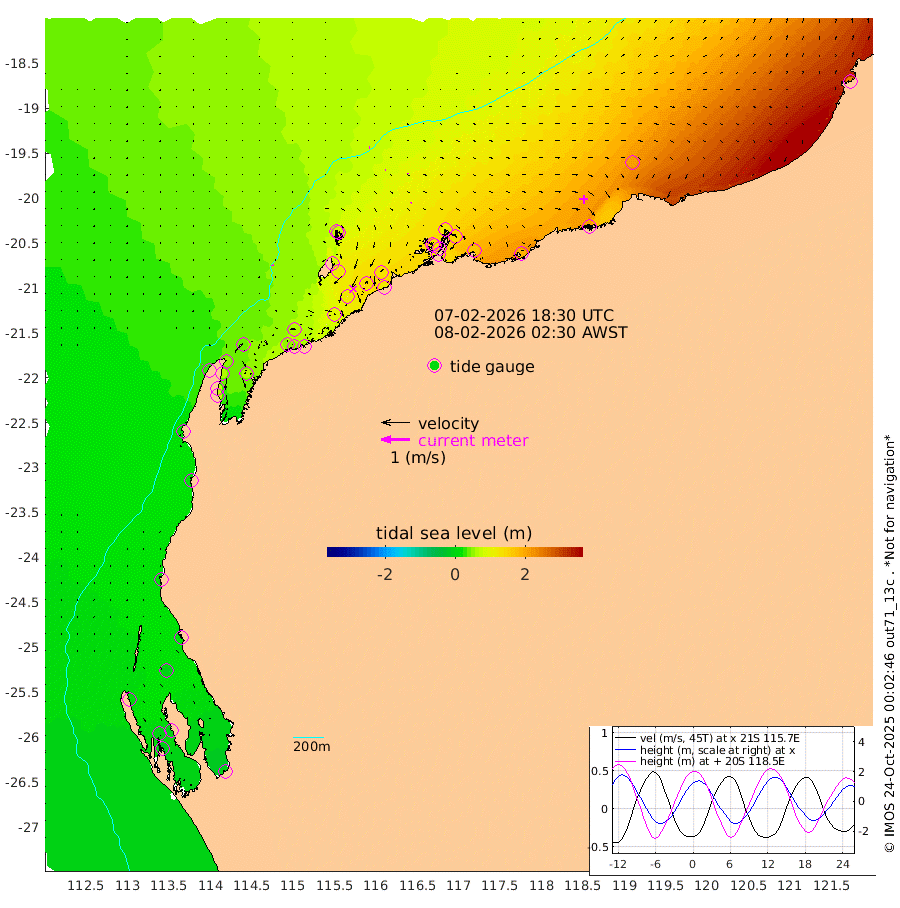 5cm/s -27T +12cm/s rms + 5cm/s -173T. NWSBAR 206m 1cm/s -175T +22cm/s rms + 10cm/s -148T. TAN100 109m 3cm/s 81T +11cm/s rms + 8cm/s -129T. PIL200 208m 2cm/s 69T +13cm/s rms + 7cm/s -137T. PIL100 105m 3cm/s 49T +12cm/s rms + 2cm/s -92T. PIL050 55m 1cm/s -148T +18cm/s rms + 4cm/s -149T. NRSNIN 61m 4cm/s -9T +6cm/s rms + 3cm/s 112T. NW Shelf M6 65m 5cm Withnell Point -4cm Denham -5cm Shark Bay (Inr Bn) -1cm Shark Bay -11cm Useless Loop -9cm Hamelin Pool 20cm Carnarvon 13cm Cape Cuvier 17cm Coral Bay 20cm Norwegian Bay 69cm Badjirrajirra 26cm Tantabiddi 47cm Point Murat 59cm Exmouth 71cm Learmonth 58cm Y Island 39cm North Muiron Island 50cm Roller 55cm Ashburton North 60cm Onslow (Beadon Creek) 58cm Thevenard Island 100cm Large Island 123cm North Sandy Island 88cm Barrow Island (Wapet Landing) 118cm Barrow Island (Tanker Mooring) 130cm Withnell Bay 84cm Trimouille Island 67cm North West Island 119cm Fortescue Road 126cm Steamboat Island 142cm Sholl Island 127cm Fairway Beacon 127cm Mawby Island 131cm Dampier (King Bay) 121cm Cape Legendre 146cm Hauy Island 168cm Port Walcott (Cape Lambert) 181cm Depuch Island 212cm Port Hedland 210cm Bedout Island 242cm Lagrange Bay