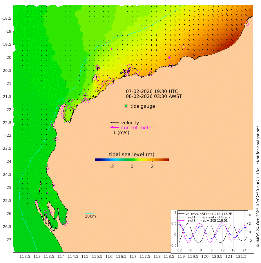 7cm/s -68T +12cm/s rms + 5cm/s -173T. NWSBAR 206m 5cm/s -145T +22cm/s rms + 10cm/s -148T. TAN100 109m 6cm/s -61T +11cm/s rms + 8cm/s -129T. PIL200 208m 12cm/s -44T +13cm/s rms + 7cm/s -137T. PIL100 105m 15cm/s -38T +12cm/s rms + 2cm/s -92T. PIL050 55m 5cm/s -135T +18cm/s rms + 4cm/s -149T. NRSNIN 61m 18cm/s -49T +6cm/s rms + 3cm/s 112T. NW Shelf M6 65m 5cm Withnell Point 0cm Denham -2cm Shark Bay (Inr Bn) 2cm Shark Bay -8cm Useless Loop -10cm Hamelin Pool 15cm Carnarvon 4cm Cape Cuvier 5cm Coral Bay 9cm Norwegian Bay 62cm Badjirrajirra 13cm Tantabiddi 38cm Point Murat 52cm Exmouth 64cm Learmonth 44cm Y Island 26cm North Muiron Island 35cm Roller 39cm Ashburton North 46cm Onslow (Beadon Creek) 42cm Thevenard Island 90cm Large Island 112cm North Sandy Island 72cm Barrow Island (Wapet Landing) 111cm Barrow Island (Tanker Mooring) 102cm Withnell Bay 73cm Trimouille Island 50cm North West Island 103cm Fortescue Road 99cm Steamboat Island 131cm Sholl Island 101cm Fairway Beacon 99cm Mawby Island 103cm Dampier (King Bay) 96cm Cape Legendre 124cm Hauy Island 137cm Port Walcott (Cape Lambert) 145cm Depuch Island 173cm Port Hedland 157cm Bedout Island 148cm Lagrange Bay