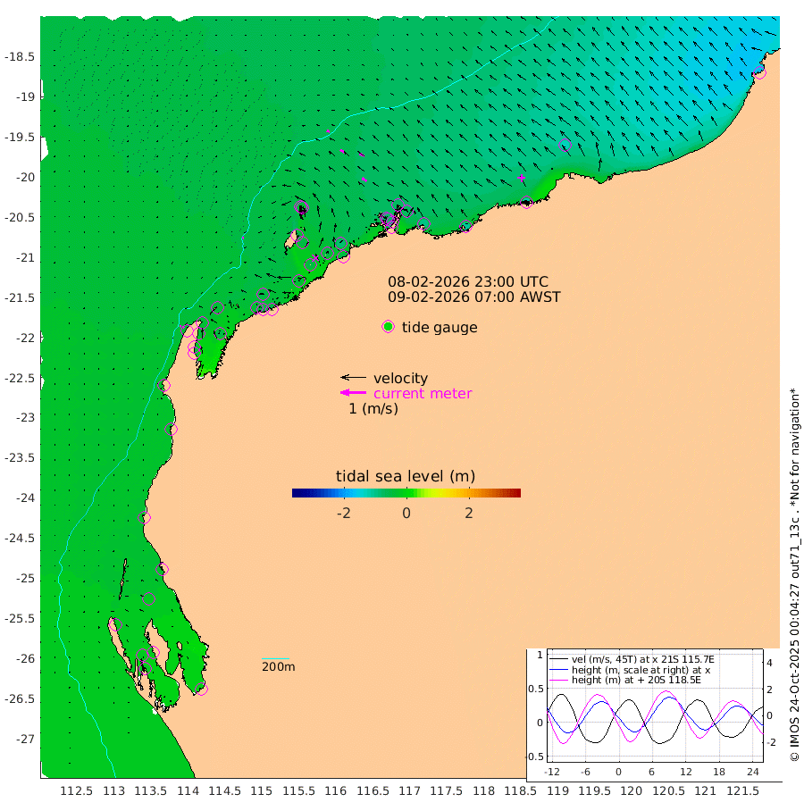 5cm/s -115T +12cm/s rms + 5cm/s -173T. NWSBAR 206m 7cm/s -144T +22cm/s rms + 10cm/s -148T. TAN100 109m 11cm/s -73T +11cm/s rms + 8cm/s -129T. PIL200 208m 18cm/s -56T +13cm/s rms + 7cm/s -137T. PIL100 105m 22cm/s -55T +12cm/s rms + 2cm/s -92T. PIL050 55m 6cm/s -135T +18cm/s rms + 4cm/s -149T. NRSNIN 61m 21cm/s -69T +6cm/s rms + 3cm/s 112T. NW Shelf M6 65m -16cm Withnell Point -14cm Denham -14cm Shark Bay (Inr Bn) -14cm Shark Bay -16cm Useless Loop -3cm Hamelin Pool -25cm Carnarvon -28cm Cape Cuvier -31cm Coral Bay -29cm Norwegian Bay -40cm Badjirrajirra -34cm Tantabiddi -35cm Point Murat -37cm Exmouth -38cm Learmonth -46cm Y Island -40cm North Muiron Island -45cm Roller -46cm Ashburton North -47cm Onslow (Beadon Creek) -47cm Thevenard Island -38cm Large Island -55cm North Sandy Island -54cm Barrow Island (Wapet Landing) -50cm Barrow Island (Tanker Mooring) -82cm Withnell Bay -44cm Trimouille Island -51cm North West Island -49cm Fortescue Road -79cm Steamboat Island -56cm Sholl Island -78cm Fairway Beacon -83cm Mawby Island -80cm Dampier (King Bay) -77cm Cape Legendre -73cm Hauy Island -92cm Port Walcott (Cape Lambert) -105cm Depuch Island -115cm Port Hedland -134cm Bedout Island -174cm Lagrange Bay