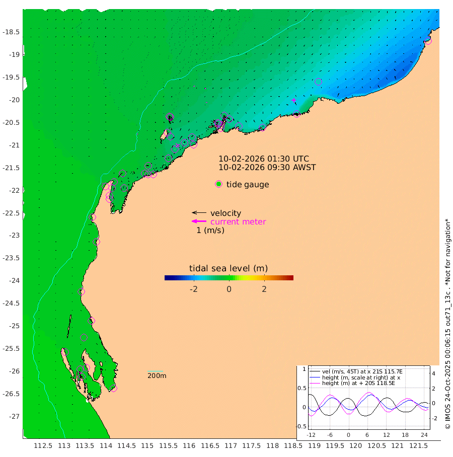 2cm/s 121T +12cm/s rms + 5cm/s -173T. NWSBAR 206m 2cm/s 48T +22cm/s rms + 10cm/s -148T. TAN100 109m 0cm/s 170T +11cm/s rms + 8cm/s -129T. PIL200 208m 3cm/s 164T +13cm/s rms + 7cm/s -137T. PIL100 105m 3cm/s -178T +12cm/s rms + 2cm/s -92T. PIL050 55m 2cm/s 50T +18cm/s rms + 4cm/s -149T. NRSNIN 61m 7cm/s -167T +6cm/s rms + 3cm/s 112T. NW Shelf M6 65m -15cm Withnell Point -21cm Denham -19cm Shark Bay (Inr Bn) -21cm Shark Bay -22cm Useless Loop -3cm Hamelin Pool -21cm Carnarvon -13cm Cape Cuvier -16cm Coral Bay -18cm Norwegian Bay -53cm Badjirrajirra -21cm Tantabiddi -37cm Point Murat -46cm Exmouth -50cm Learmonth -47cm Y Island -32cm North Muiron Island -39cm Roller -40cm Ashburton North -45cm Onslow (Beadon Creek) -41cm Thevenard Island -54cm Large Island -82cm North Sandy Island -61cm Barrow Island (Wapet Landing) -81cm Barrow Island (Tanker Mooring) -84cm Withnell Bay -48cm Trimouille Island -46cm North West Island -72cm Fortescue Road -81cm Steamboat Island -90cm Sholl Island -83cm Fairway Beacon -85cm Mawby Island -84cm Dampier (King Bay) -78cm Cape Legendre -91cm Hauy Island -106cm Port Walcott (Cape Lambert) -112cm Depuch Island -133cm Port Hedland -133cm Bedout Island -141cm Lagrange Bay