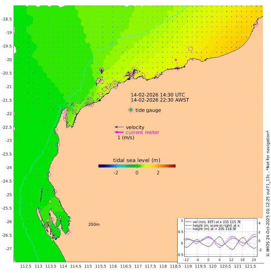 1cm/s -87T +12cm/s rms + 5cm/s -173T. NWSBAR 206m 2cm/s -130T +22cm/s rms + 10cm/s -148T. TAN100 109m 2cm/s -80T +11cm/s rms + 8cm/s -129T. PIL200 208m 4cm/s -32T +13cm/s rms + 7cm/s -137T. PIL100 105m 4cm/s -2T +12cm/s rms + 2cm/s -92T. PIL050 55m 2cm/s -126T +18cm/s rms + 4cm/s -149T. NRSNIN 61m 7cm/s -38T +6cm/s rms + 3cm/s 112T. NW Shelf M6 65m 25cm Withnell Point 36cm Denham 35cm Shark Bay (Inr Bn) 37cm Shark Bay 38cm Useless Loop 5cm Hamelin Pool 24cm Carnarvon 14cm Cape Cuvier 16cm Coral Bay 15cm Norwegian Bay 40cm Badjirrajirra 20cm Tantabiddi 31cm Point Murat 37cm Exmouth 41cm Learmonth 34cm Y Island 26cm North Muiron Island 29cm Roller 33cm Ashburton North 36cm Onslow (Beadon Creek) 35cm Thevenard Island 79cm Large Island 61cm North Sandy Island 48cm Barrow Island (Wapet Landing) 64cm Barrow Island (Tanker Mooring) 64cm Withnell Bay 45cm Trimouille Island 39cm North West Island 93cm Fortescue Road 53cm Steamboat Island 47cm Sholl Island 62cm Fairway Beacon 60cm Mawby Island 65cm Dampier (King Bay) 61cm Cape Legendre 67cm Hauy Island 80cm Port Walcott (Cape Lambert) 92cm Depuch Island 98cm Port Hedland 103cm Bedout Island 183cm Lagrange Bay