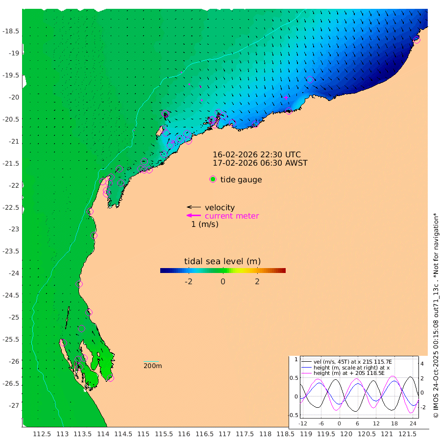5cm/s 71T +12cm/s rms + 5cm/s -173T. NWSBAR 206m 0cm/s 150T +22cm/s rms + 10cm/s -148T. TAN100 109m 6cm/s 106T +11cm/s rms + 8cm/s -129T. PIL200 208m 10cm/s 138T +13cm/s rms + 7cm/s -137T. PIL100 105m 12cm/s 148T +12cm/s rms + 2cm/s -92T. PIL050 55m 1cm/s 135T +18cm/s rms + 4cm/s -149T. NRSNIN 61m 16cm/s 152T +6cm/s rms + 3cm/s 112T. NW Shelf M6 65m -41cm Withnell Point -42cm Denham -36cm Shark Bay (Inr Bn) -42cm Shark Bay -29cm Useless Loop 15cm Hamelin Pool -56cm Carnarvon -38cm Cape Cuvier -39cm Coral Bay -39cm Norwegian Bay -92cm Badjirrajirra -47cm Tantabiddi -70cm Point Murat -83cm Exmouth -91cm Learmonth -76cm Y Island -59cm North Muiron Island -66cm Roller -72cm Ashburton North -79cm Onslow (Beadon Creek) -75cm Thevenard Island -133cm Large Island -144cm North Sandy Island -104cm Barrow Island (Wapet Landing) -141cm Barrow Island (Tanker Mooring) -134cm Withnell Bay -94cm Trimouille Island -88cm North West Island -146cm Fortescue Road -139cm Steamboat Island -131cm Sholl Island -133cm Fairway Beacon -133cm Mawby Island -135cm Dampier (King Bay) -128cm Cape Legendre -151cm Hauy Island -169cm Port Walcott (Cape Lambert) -199cm Depuch Island -203cm Port Hedland -187cm Bedout Island -227cm Lagrange Bay
