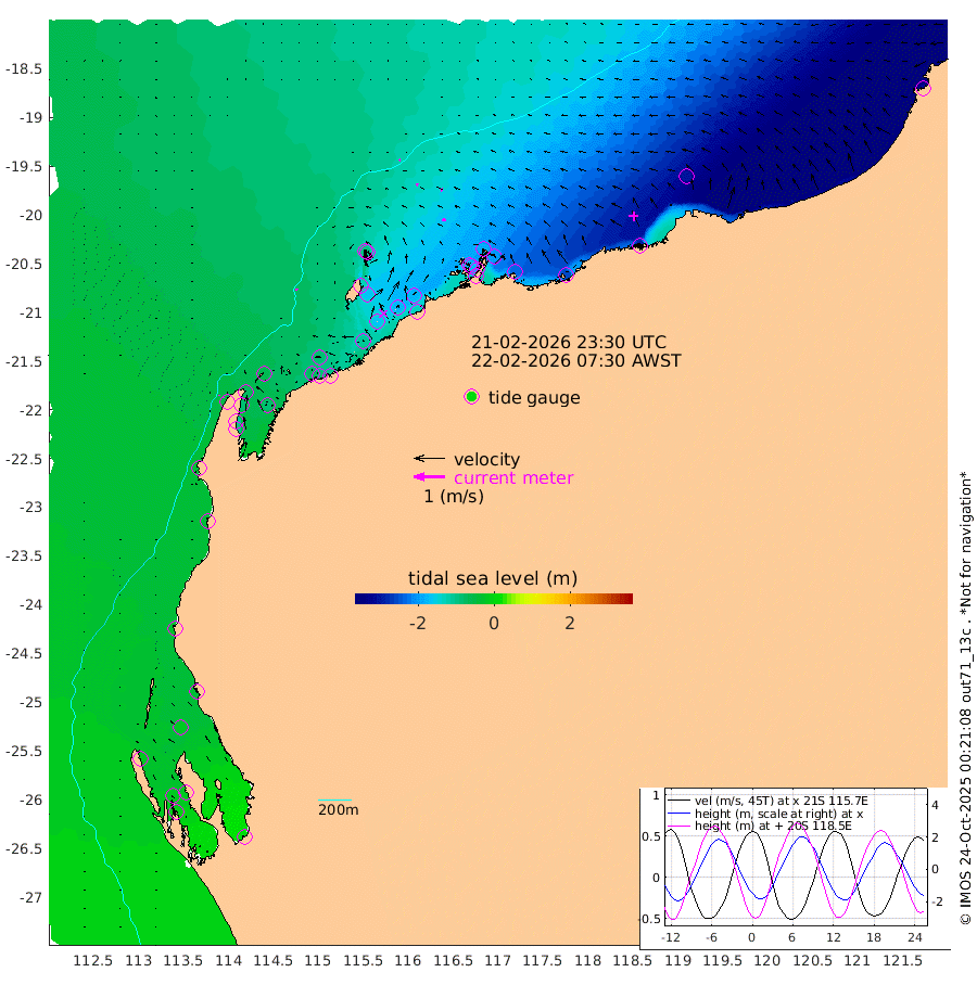 4cm/s 156T +12cm/s rms + 5cm/s -173T. NWSBAR 206m 3cm/s -142T +22cm/s rms + 10cm/s -148T. TAN100 109m 5cm/s -72T +11cm/s rms + 8cm/s -129T. PIL200 208m 7cm/s -75T +13cm/s rms + 7cm/s -137T. PIL100 105m 10cm/s -79T +12cm/s rms + 2cm/s -92T. PIL050 55m 2cm/s -144T +18cm/s rms + 4cm/s -149T. NRSNIN 61m 8cm/s -107T +6cm/s rms + 3cm/s 112T. NW Shelf M6 65m -21cm Withnell Point -14cm Denham -12cm Shark Bay (Inr Bn) -15cm Shark Bay -7cm Useless Loop 8cm Hamelin Pool -43cm Carnarvon -33cm Cape Cuvier -37cm Coral Bay -40cm Norwegian Bay -102cm Badjirrajirra -48cm Tantabiddi -74cm Point Murat -89cm Exmouth -100cm Learmonth -89cm Y Island -65cm North Muiron Island -78cm Roller -86cm Ashburton North -94cm Onslow (Beadon Creek) -89cm Thevenard Island -107cm Large Island -166cm North Sandy Island -126cm Barrow Island (Wapet Landing) -160cm Barrow Island (Tanker Mooring) -183cm Withnell Bay -120cm Trimouille Island -97cm North West Island -134cm Fortescue Road -178cm Steamboat Island -178cm Sholl Island -179cm Fairway Beacon -182cm Mawby Island -183cm Dampier (King Bay) -183cm Cape Legendre -197cm Hauy Island -229cm Port Walcott (Cape Lambert) -249cm Depuch Island -286cm Port Hedland -293cm Bedout Island -307cm Lagrange Bay