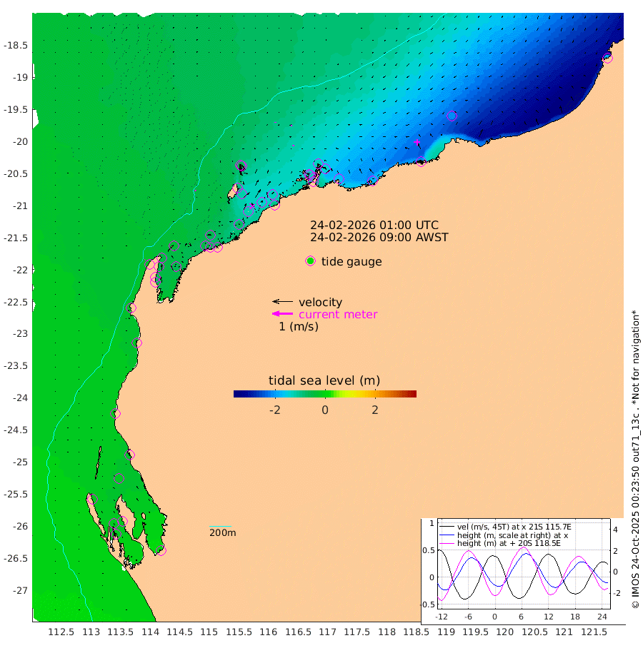4cm/s 132T +12cm/s rms + 5cm/s -173T. NWSBAR 206m 2cm/s 39T +22cm/s rms + 10cm/s -148T. TAN100 109m 0cm/s -118T +11cm/s rms + 8cm/s -129T. PIL200 208m 3cm/s 177T +13cm/s rms + 7cm/s -137T. PIL100 105m 5cm/s -162T +12cm/s rms + 2cm/s -92T. PIL050 55m 2cm/s 49T +18cm/s rms + 4cm/s -149T. NRSNIN 61m 6cm/s 177T +6cm/s rms + 3cm/s 112T. NW Shelf M6 65m -14cm Withnell Point -17cm Denham -16cm Shark Bay (Inr Bn) -17cm Shark Bay -16cm Useless Loop -1cm Hamelin Pool -26cm Carnarvon -16cm Cape Cuvier -19cm Coral Bay -23cm Norwegian Bay -77cm Badjirrajirra -27cm Tantabiddi -52cm Point Murat -66cm Exmouth -72cm Learmonth -63cm Y Island -42cm North Muiron Island -51cm Roller -57cm Ashburton North -65cm Onslow (Beadon Creek) -59cm Thevenard Island -70cm Large Island -121cm North Sandy Island -90cm Barrow Island (Wapet Landing) -122cm Barrow Island (Tanker Mooring) -129cm Withnell Bay -87cm Trimouille Island -65cm North West Island -91cm Fortescue Road -128cm Steamboat Island -140cm Sholl Island -127cm Fairway Beacon -127cm Mawby Island -129cm Dampier (King Bay) -128cm Cape Legendre -143cm Hauy Island -166cm Port Walcott (Cape Lambert) -173cm Depuch Island -208cm Port Hedland -211cm Bedout Island -184cm Lagrange Bay