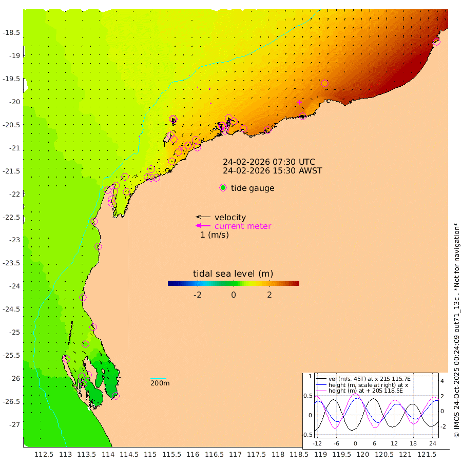 5cm/s -81T +12cm/s rms + 5cm/s -173T. NWSBAR 206m 0cm/s -37T +22cm/s rms + 10cm/s -148T. TAN100 109m 2cm/s -39T +11cm/s rms + 8cm/s -129T. PIL200 208m 7cm/s -10T +13cm/s rms + 7cm/s -137T. PIL100 105m 8cm/s 1T +12cm/s rms + 2cm/s -92T. PIL050 55m 1cm/s -68T +18cm/s rms + 4cm/s -149T. NRSNIN 61m 8cm/s 16T +6cm/s rms + 3cm/s 112T. NW Shelf M6 65m 48cm Withnell Point 45cm Denham 42cm Shark Bay (Inr Bn) 44cm Shark Bay 35cm Useless Loop -13cm Hamelin Pool 66cm Carnarvon 50cm Cape Cuvier 52cm Coral Bay 57cm Norwegian Bay 113cm Badjirrajirra 59cm Tantabiddi 86cm Point Murat 101cm Exmouth 109cm Learmonth 96cm Y Island 75cm North Muiron Island 84cm Roller 89cm Ashburton North 98cm Onslow (Beadon Creek) 92cm Thevenard Island 114cm Large Island 158cm North Sandy Island 124cm Barrow Island (Wapet Landing) 157cm Barrow Island (Tanker Mooring) 159cm Withnell Bay 120cm Trimouille Island 99cm North West Island 124cm Fortescue Road 163cm Steamboat Island 164cm Sholl Island 157cm Fairway Beacon 158cm Mawby Island 159cm Dampier (King Bay) 164cm Cape Legendre 173cm Hauy Island 194cm Port Walcott (Cape Lambert) 205cm Depuch Island 232cm Port Hedland 212cm Bedout Island 210cm Lagrange Bay