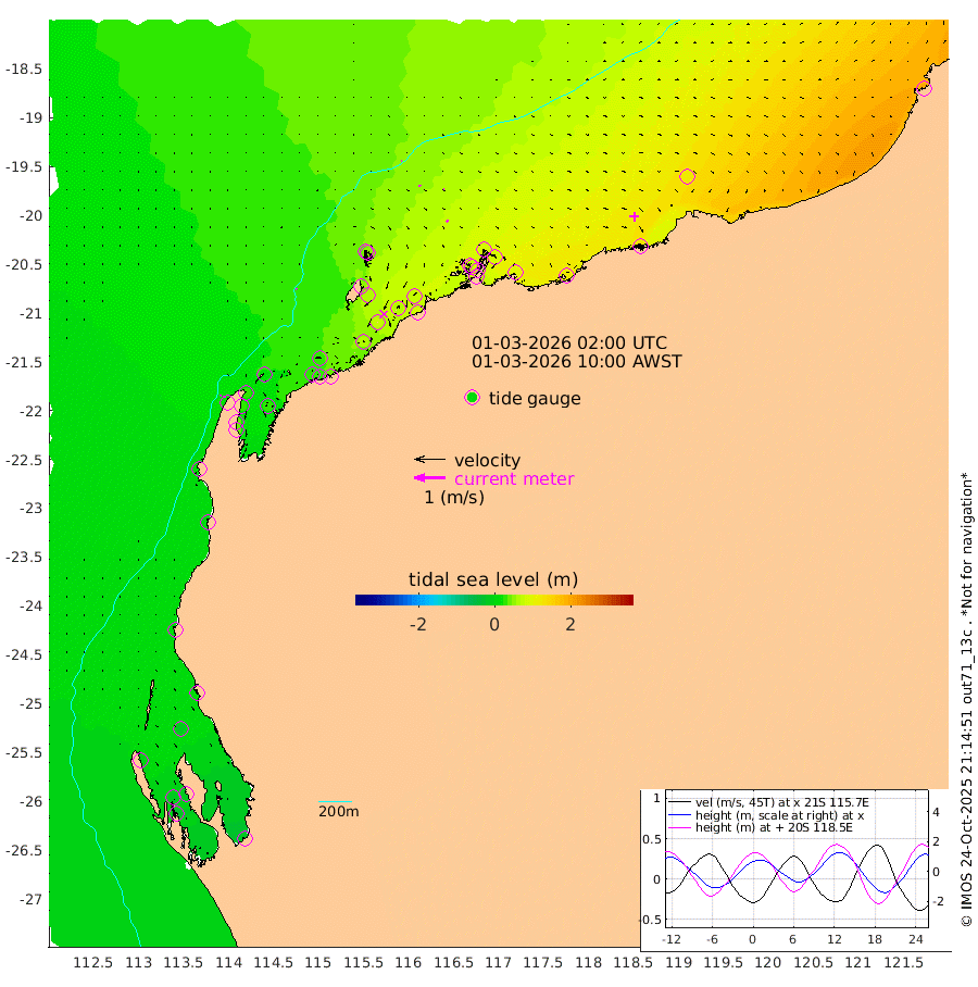 3cm/s -33T +12cm/s rms + 5cm/s -173T. NWSBAR 206m 3cm/s 47T +22cm/s rms + 10cm/s -148T. TAN100 109m 2cm/s 125T +11cm/s rms + 8cm/s -129T. PIL200 208m 5cm/s 115T +13cm/s rms + 7cm/s -137T. PIL100 105m 6cm/s 106T +12cm/s rms + 2cm/s -92T. PIL050 55m 4cm/s 43T +18cm/s rms + 4cm/s -149T. NRSNIN 61m 3cm/s 103T +6cm/s rms + 3cm/s 112T. NW Shelf M6 65m -3cm Withnell Point -20cm Denham -21cm Shark Bay (Inr Bn) -20cm Shark Bay -31cm Useless Loop -16cm Hamelin Pool 12cm Carnarvon 9cm Cape Cuvier 9cm Coral Bay 12cm Norwegian Bay 34cm Badjirrajirra 14cm Tantabiddi 24cm Point Murat 29cm Exmouth 37cm Learmonth 27cm Y Island 19cm North Muiron Island 25cm Roller 31cm Ashburton North 34cm Onslow (Beadon Creek) 32cm Thevenard Island 62cm Large Island 69cm North Sandy Island 50cm Barrow Island (Wapet Landing) 65cm Barrow Island (Tanker Mooring) 79cm Withnell Bay 53cm Trimouille Island 36cm North West Island 81cm Fortescue Road 73cm Steamboat Island 65cm Sholl Island 78cm Fairway Beacon 76cm Mawby Island 79cm Dampier (King Bay) 85cm Cape Legendre 90cm Hauy Island 101cm Port Walcott (Cape Lambert) 120cm Depuch Island 128cm Port Hedland 123cm Bedout Island 193cm Lagrange Bay