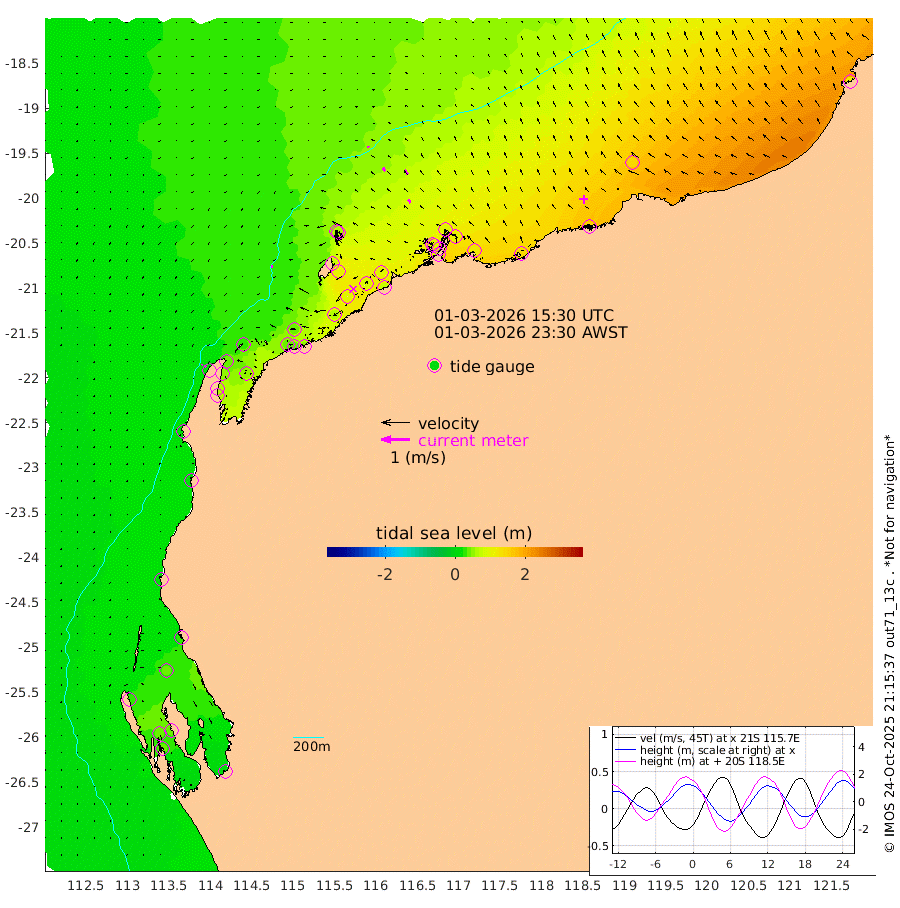 5cm/s -95T +12cm/s rms + 5cm/s -173T. NWSBAR 206m 5cm/s -133T +22cm/s rms + 10cm/s -148T. TAN100 109m 7cm/s -68T +11cm/s rms + 8cm/s -129T. PIL200 208m 12cm/s -44T +13cm/s rms + 7cm/s -137T. PIL100 105m 14cm/s -35T +12cm/s rms + 2cm/s -92T. PIL050 55m 5cm/s -129T +18cm/s rms + 4cm/s -149T. NRSNIN 61m 20cm/s -39T +6cm/s rms + 3cm/s 112T. NW Shelf M6 65m 30cm Withnell Point 39cm Denham 39cm Shark Bay (Inr Bn) 38cm Shark Bay 37cm Useless Loop 1cm Hamelin Pool 30cm Carnarvon 14cm Cape Cuvier 14cm Coral Bay 14cm Norwegian Bay 62cm Badjirrajirra 21cm Tantabiddi 42cm Point Murat 54cm Exmouth 65cm Learmonth 45cm Y Island 31cm North Muiron Island 38cm Roller 42cm Ashburton North 49cm Onslow (Beadon Creek) 45cm Thevenard Island 67cm Large Island 99cm North Sandy Island 70cm Barrow Island (Wapet Landing) 102cm Barrow Island (Tanker Mooring) 94cm Withnell Bay 65cm Trimouille Island 57cm North West Island 73cm Fortescue Road 96cm Steamboat Island 90cm Sholl Island 93cm Fairway Beacon 95cm Mawby Island 94cm Dampier (King Bay) 94cm Cape Legendre 109cm Hauy Island 123cm Port Walcott (Cape Lambert) 146cm Depuch Island 152cm Port Hedland 136cm Bedout Island 118cm Lagrange Bay