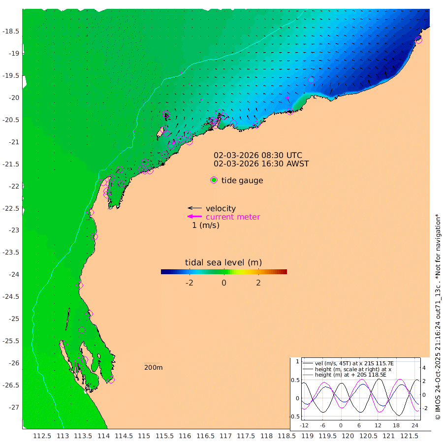4cm/s 166T +12cm/s rms + 5cm/s -173T. NWSBAR 206m 1cm/s -128T +22cm/s rms + 10cm/s -148T. TAN100 109m 5cm/s -72T +11cm/s rms + 8cm/s -129T. PIL200 208m 8cm/s -68T +13cm/s rms + 7cm/s -137T. PIL100 105m 10cm/s -75T +12cm/s rms + 2cm/s -92T. PIL050 55m 1cm/s -128T +18cm/s rms + 4cm/s -149T. NRSNIN 61m 6cm/s -107T +6cm/s rms + 3cm/s 112T. NW Shelf M6 65m -9cm Withnell Point 0cm Denham -2cm Shark Bay (Inr Bn) 1cm Shark Bay 4cm Useless Loop 5cm Hamelin Pool -18cm Carnarvon -12cm Cape Cuvier -15cm Coral Bay -17cm Norwegian Bay -56cm Badjirrajirra -22cm Tantabiddi -38cm Point Murat -48cm Exmouth -63cm Learmonth -45cm Y Island -32cm North Muiron Island -41cm Roller -48cm Ashburton North -53cm Onslow (Beadon Creek) -50cm Thevenard Island -71cm Large Island -95cm North Sandy Island -76cm Barrow Island (Wapet Landing) -95cm Barrow Island (Tanker Mooring) -117cm Withnell Bay -73cm Trimouille Island -60cm North West Island -93cm Fortescue Road -107cm Steamboat Island -97cm Sholl Island -114cm Fairway Beacon -116cm Mawby Island -117cm Dampier (King Bay) -122cm Cape Legendre -127cm Hauy Island -148cm Port Walcott (Cape Lambert) -166cm Depuch Island -188cm Port Hedland -180cm Bedout Island -248cm Lagrange Bay