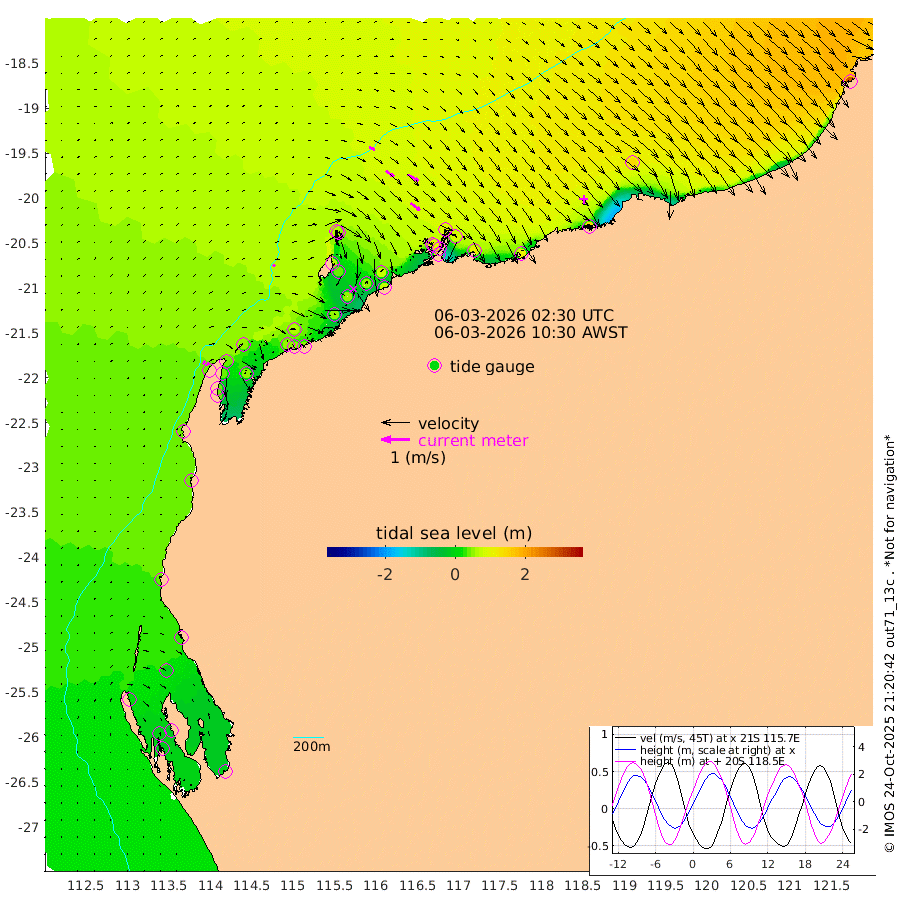 9cm/s 58T +12cm/s rms + 5cm/s -173T. NWSBAR 206m 12cm/s 41T +22cm/s rms + 10cm/s -148T. TAN100 109m 21cm/s 109T +11cm/s rms + 8cm/s -129T. PIL200 208m 36cm/s 125T +13cm/s rms + 7cm/s -137T. PIL100 105m 42cm/s 128T +12cm/s rms + 2cm/s -92T. PIL050 55m 13cm/s 47T +18cm/s rms + 4cm/s -149T. NRSNIN 61m 42cm/s 121T +6cm/s rms + 3cm/s 112T. NW Shelf M6 65m 10cm Withnell Point -12cm Denham -9cm Shark Bay (Inr Bn) -10cm Shark Bay -16cm Useless Loop -9cm Hamelin Pool 27cm Carnarvon 38cm Cape Cuvier 43cm Coral Bay 42cm Norwegian Bay 35cm Badjirrajirra 45cm Tantabiddi 37cm Point Murat 35cm Exmouth 41cm Learmonth 48cm Y Island 47cm North Muiron Island 54cm Roller 56cm Ashburton North 54cm Onslow (Beadon Creek) 57cm Thevenard Island 52cm Large Island 50cm North Sandy Island 60cm Barrow Island (Wapet Landing) 40cm Barrow Island (Tanker Mooring) 96cm Withnell Bay 54cm Trimouille Island 59cm North West Island 68cm Fortescue Road 78cm Steamboat Island 48cm Sholl Island 92cm Fairway Beacon 97cm Mawby Island 95cm Dampier (King Bay) 99cm Cape Legendre 80cm Hauy Island 103cm Port Walcott (Cape Lambert) 112cm Depuch Island 130cm Port Hedland 145cm Bedout Island 288cm Lagrange Bay
