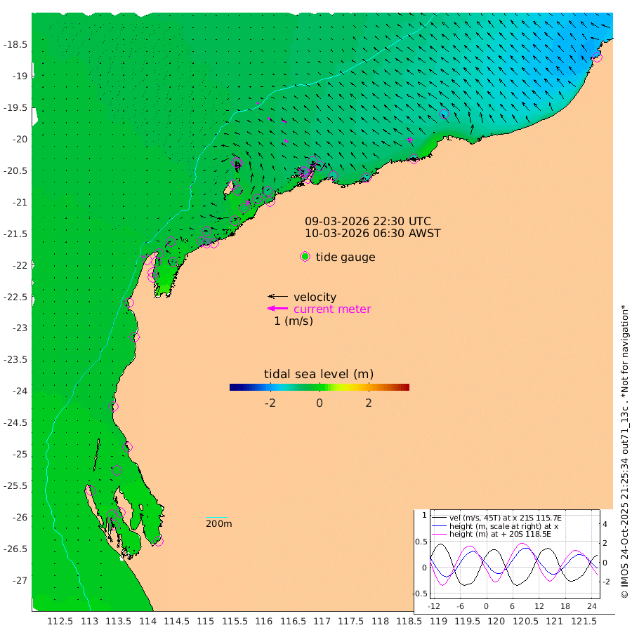 5cm/s -124T +12cm/s rms + 5cm/s -173T. NWSBAR 206m 5cm/s -144T +22cm/s rms + 10cm/s -148T. TAN100 109m 11cm/s -74T +11cm/s rms + 8cm/s -129T. PIL200 208m 17cm/s -57T +13cm/s rms + 7cm/s -137T. PIL100 105m 22cm/s -56T +12cm/s rms + 2cm/s -92T. PIL050 55m 5cm/s -134T +18cm/s rms + 4cm/s -149T. NRSNIN 61m 22cm/s -66T +6cm/s rms + 3cm/s 112T. NW Shelf M6 65m -13cm Withnell Point -13cm Denham -14cm Shark Bay (Inr Bn) -14cm Shark Bay -16cm Useless Loop -5cm Hamelin Pool -21cm Carnarvon -23cm Cape Cuvier -27cm Coral Bay -25cm Norwegian Bay -40cm Badjirrajirra -31cm Tantabiddi -34cm Point Murat -37cm Exmouth -40cm Learmonth -46cm Y Island -38cm North Muiron Island -45cm Roller -45cm Ashburton North -47cm Onslow (Beadon Creek) -47cm Thevenard Island -31cm Large Island -62cm North Sandy Island -57cm Barrow Island (Wapet Landing) -56cm Barrow Island (Tanker Mooring) -88cm Withnell Bay -48cm Trimouille Island -52cm North West Island -42cm Fortescue Road -83cm Steamboat Island -65cm Sholl Island -84cm Fairway Beacon -90cm Mawby Island -87cm Dampier (King Bay) -83cm Cape Legendre -82cm Hauy Island -103cm Port Walcott (Cape Lambert) -116cm Depuch Island -130cm Port Hedland -149cm Bedout Island -179cm Lagrange Bay
