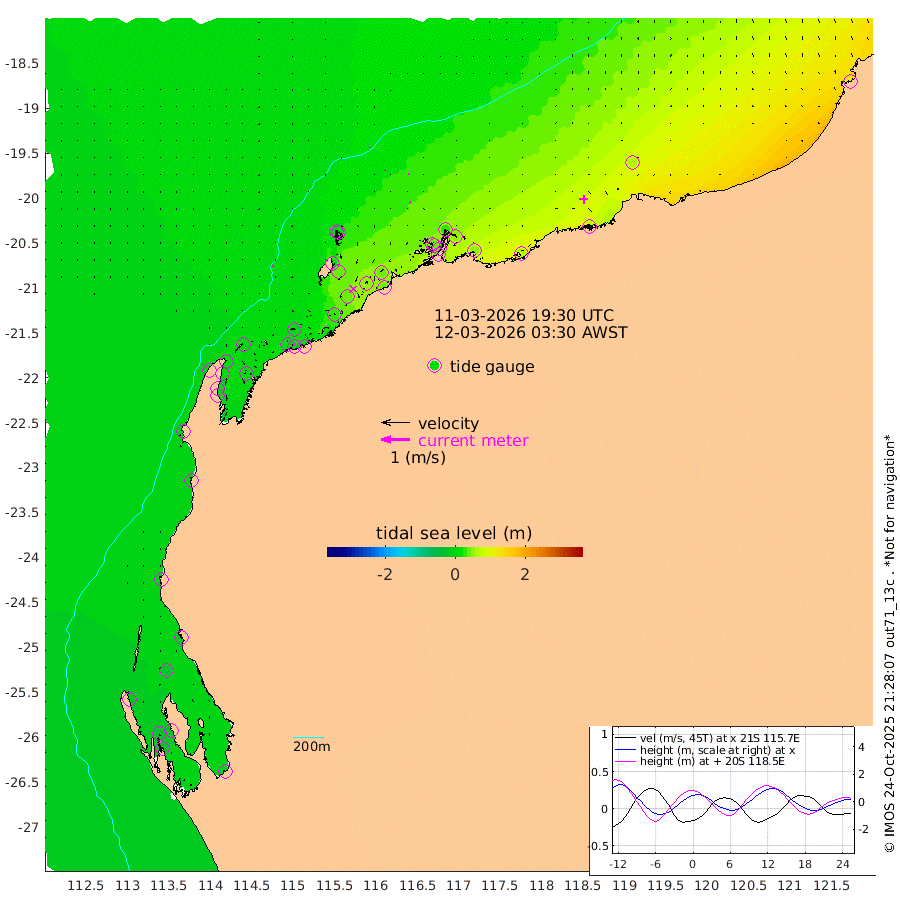 3cm/s -38T +12cm/s rms + 5cm/s -173T. NWSBAR 206m 1cm/s -153T +22cm/s rms + 10cm/s -148T. TAN100 109m 1cm/s 33T +11cm/s rms + 8cm/s -129T. PIL200 208m 2cm/s -39T +13cm/s rms + 7cm/s -137T. PIL100 105m 3cm/s -37T +12cm/s rms + 2cm/s -92T. PIL050 55m 2cm/s -142T +18cm/s rms + 4cm/s -149T. NRSNIN 61m 4cm/s 62T +6cm/s rms + 3cm/s 112T. NW Shelf M6 65m -18cm Withnell Point -26cm Denham -26cm Shark Bay (Inr Bn) -27cm Shark Bay -29cm Useless Loop -3cm Hamelin Pool -11cm Carnarvon -12cm Cape Cuvier -11cm Coral Bay -7cm Norwegian Bay 14cm Badjirrajirra -7cm Tantabiddi 3cm Point Murat 10cm Exmouth 16cm Learmonth 11cm Y Island 1cm North Muiron Island 8cm Roller 5cm Ashburton North 8cm Onslow (Beadon Creek) 6cm Thevenard Island 24cm Large Island 39cm North Sandy Island 20cm Barrow Island (Wapet Landing) 36cm Barrow Island (Tanker Mooring) 36cm Withnell Bay 16cm Trimouille Island 9cm North West Island 40cm Fortescue Road 37cm Steamboat Island 54cm Sholl Island 37cm Fairway Beacon 39cm Mawby Island 36cm Dampier (King Bay) 31cm Cape Legendre 49cm Hauy Island 53cm Port Walcott (Cape Lambert) 60cm Depuch Island 72cm Port Hedland 62cm Bedout Island 115cm Lagrange Bay