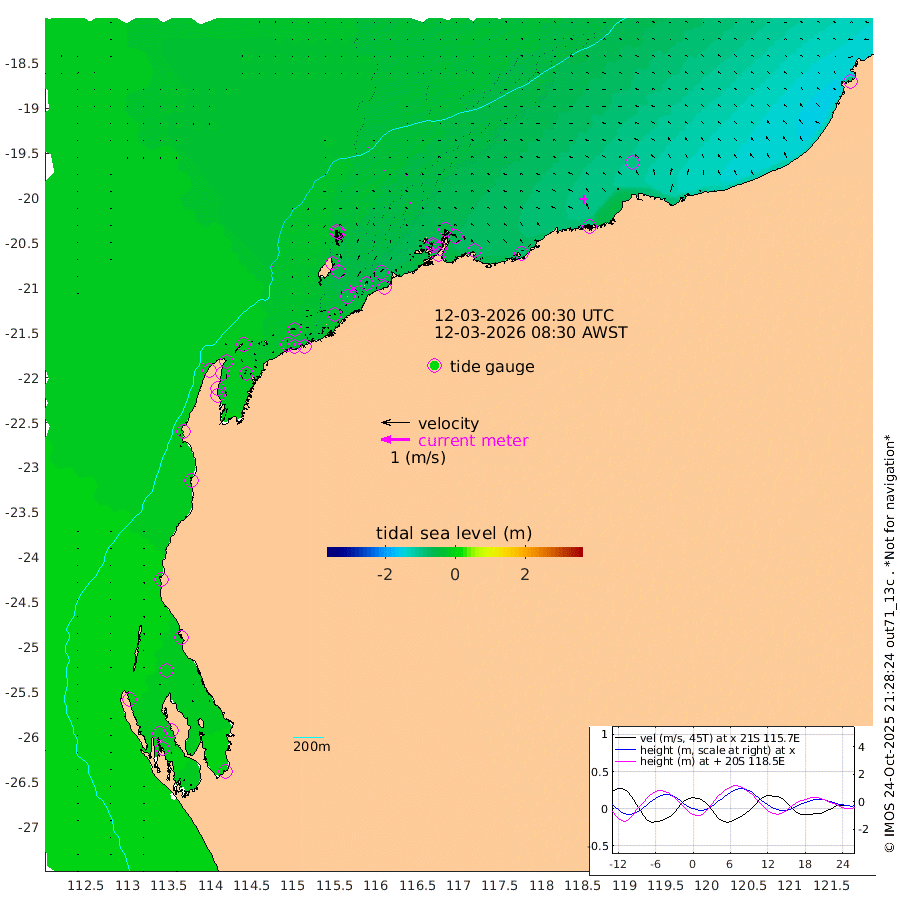 1cm/s 153T +12cm/s rms + 5cm/s -173T. NWSBAR 206m 1cm/s 56T +22cm/s rms + 10cm/s -148T. TAN100 109m 2cm/s -93T +11cm/s rms + 8cm/s -129T. PIL200 208m 1cm/s -121T +13cm/s rms + 7cm/s -137T. PIL100 105m 3cm/s -101T +12cm/s rms + 2cm/s -92T. PIL050 55m 2cm/s 45T +18cm/s rms + 4cm/s -149T. NRSNIN 61m 5cm/s -101T +6cm/s rms + 3cm/s 112T. NW Shelf M6 65m -10cm Withnell Point -17cm Denham -19cm Shark Bay (Inr Bn) -17cm Shark Bay -22cm Useless Loop -8cm Hamelin Pool -12cm Carnarvon -8cm Cape Cuvier -10cm Coral Bay -11cm Norwegian Bay -35cm Badjirrajirra -14cm Tantabiddi -24cm Point Murat -31cm Exmouth -34cm Learmonth -34cm Y Island -22cm North Muiron Island -29cm Roller -27cm Ashburton North -31cm Onslow (Beadon Creek) -28cm Thevenard Island -28cm Large Island -56cm North Sandy Island -41cm Barrow Island (Wapet Landing) -54cm Barrow Island (Tanker Mooring) -59cm Withnell Bay -38cm Trimouille Island -31cm North West Island -34cm Fortescue Road -57cm Steamboat Island -65cm Sholl Island -58cm Fairway Beacon -60cm Mawby Island -59cm Dampier (King Bay) -54cm Cape Legendre -62cm Hauy Island -75cm Port Walcott (Cape Lambert) -80cm Depuch Island -95cm Port Hedland -101cm Bedout Island -99cm Lagrange Bay