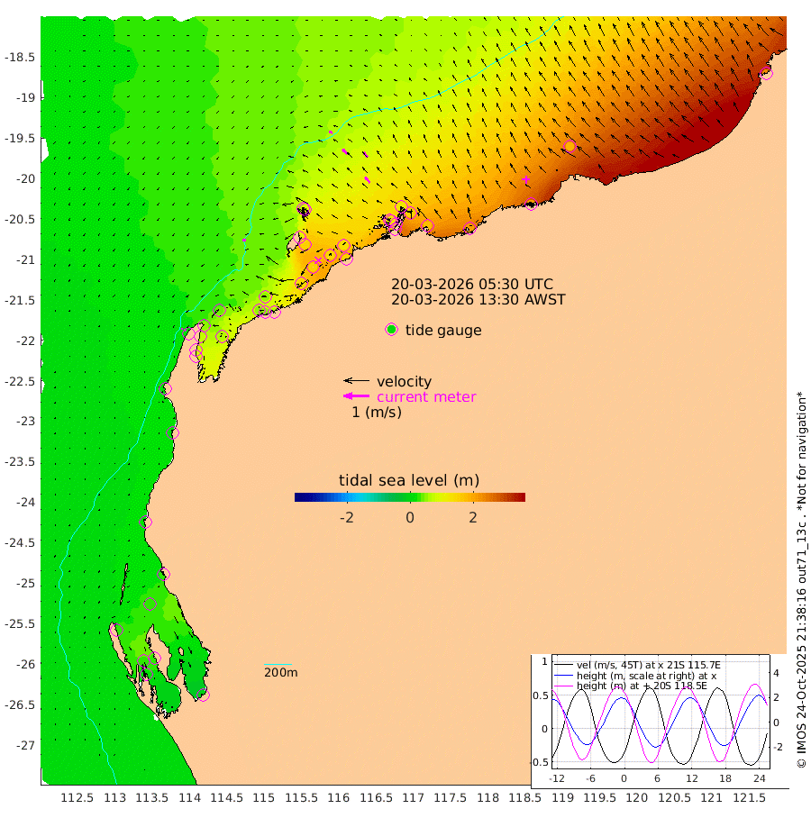 12cm/s -97T +12cm/s rms + 5cm/s -173T. NWSBAR 206m 7cm/s -136T +22cm/s rms + 10cm/s -148T. TAN100 109m 14cm/s -72T +11cm/s rms + 8cm/s -129T. PIL200 208m 24cm/s -47T +13cm/s rms + 7cm/s -137T. PIL100 105m 28cm/s -40T +12cm/s rms + 2cm/s -92T. PIL050 55m 6cm/s -127T +18cm/s rms + 4cm/s -149T. NRSNIN 61m 25cm/s -40T +6cm/s rms + 3cm/s 112T. NW Shelf M6 65m 25cm Withnell Point 32cm Denham 29cm Shark Bay (Inr Bn) 29cm Shark Bay 22cm Useless Loop -9cm Hamelin Pool 33cm Carnarvon 11cm Cape Cuvier 13cm Coral Bay 16cm Norwegian Bay 85cm Badjirrajirra 22cm Tantabiddi 55cm Point Murat 74cm Exmouth 86cm Learmonth 63cm Y Island 39cm North Muiron Island 50cm Roller 53cm Ashburton North 63cm Onslow (Beadon Creek) 55cm Thevenard Island 135cm Large Island 154cm North Sandy Island 95cm Barrow Island (Wapet Landing) 149cm Barrow Island (Tanker Mooring) 126cm Withnell Bay 96cm Trimouille Island 66cm North West Island 154cm Fortescue Road 127cm Steamboat Island 145cm Sholl Island 126cm Fairway Beacon 123cm Mawby Island 127cm Dampier (King Bay) 119cm Cape Legendre 154cm Hauy Island 171cm Port Walcott (Cape Lambert) 203cm Depuch Island 212cm Port Hedland 190cm Bedout Island 230cm Lagrange Bay