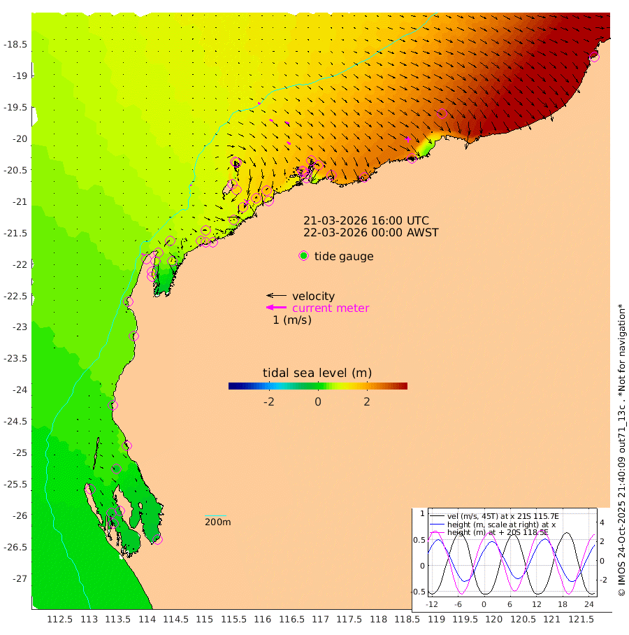 6cm/s 13T +12cm/s rms + 5cm/s -173T. NWSBAR 206m 7cm/s 44T +22cm/s rms + 10cm/s -148T. TAN100 109m 12cm/s 103T +11cm/s rms + 8cm/s -129T. PIL200 208m 18cm/s 119T +13cm/s rms + 7cm/s -137T. PIL100 105m 21cm/s 121T +12cm/s rms + 2cm/s -92T. PIL050 55m 6cm/s 45T +18cm/s rms + 4cm/s -149T. NRSNIN 61m 20cm/s 111T +6cm/s rms + 3cm/s 112T. NW Shelf M6 65m 9cm Withnell Point -15cm Denham -16cm Shark Bay (Inr Bn) -12cm Shark Bay -26cm Useless Loop -16cm Hamelin Pool 35cm Carnarvon 33cm Cape Cuvier 37cm Coral Bay 39cm Norwegian Bay 90cm Badjirrajirra 48cm Tantabiddi 67cm Point Murat 78cm Exmouth 94cm Learmonth 81cm Y Island 62cm North Muiron Island 78cm Roller 83cm Ashburton North 89cm Onslow (Beadon Creek) 87cm Thevenard Island 83cm Large Island 153cm North Sandy Island 121cm Barrow Island (Wapet Landing) 144cm Barrow Island (Tanker Mooring) 184cm Withnell Bay 112cm Trimouille Island 99cm North West Island 109cm Fortescue Road 177cm Steamboat Island 168cm Sholl Island 180cm Fairway Beacon 186cm Mawby Island 184cm Dampier (King Bay) 185cm Cape Legendre 196cm Hauy Island 228cm Port Walcott (Cape Lambert) 249cm Depuch Island 287cm Port Hedland 289cm Bedout Island 337cm Lagrange Bay