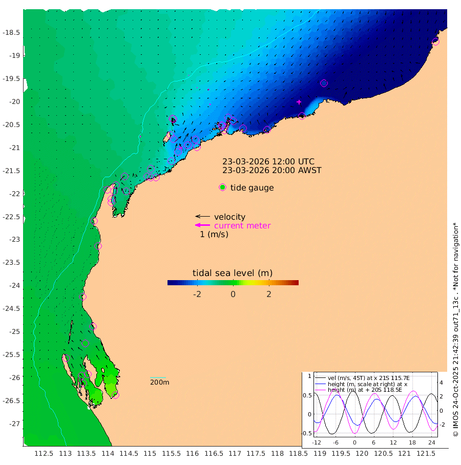 7cm/s 114T +12cm/s rms + 5cm/s -173T. NWSBAR 206m 3cm/s -138T +22cm/s rms + 10cm/s -148T. TAN100 109m 1cm/s -124T +11cm/s rms + 8cm/s -129T. PIL200 208m 4cm/s -146T +13cm/s rms + 7cm/s -137T. PIL100 105m 7cm/s -148T +12cm/s rms + 2cm/s -92T. PIL050 55m 3cm/s -144T +18cm/s rms + 4cm/s -149T. NRSNIN 61m 9cm/s -116T +6cm/s rms + 3cm/s 112T. NW Shelf M6 65m -43cm Withnell Point -20cm Denham -16cm Shark Bay (Inr Bn) -20cm Shark Bay 3cm Useless Loop 29cm Hamelin Pool -71cm Carnarvon -56cm Cape Cuvier -58cm Coral Bay -63cm Norwegian Bay -130cm Badjirrajirra -68cm Tantabiddi -98cm Point Murat -116cm Exmouth -133cm Learmonth -110cm Y Island -85cm North Muiron Island -102cm Roller -105cm Ashburton North -115cm Onslow (Beadon Creek) -110cm Thevenard Island -147cm Large Island -201cm North Sandy Island -151cm Barrow Island (Wapet Landing) -195cm Barrow Island (Tanker Mooring) -203cm Withnell Bay -148cm Trimouille Island -122cm North West Island -160cm Fortescue Road -206cm Steamboat Island -207cm Sholl Island -201cm Fairway Beacon -205cm Mawby Island -204cm Dampier (King Bay) -207cm Cape Legendre -225cm Hauy Island -251cm Port Walcott (Cape Lambert) -274cm Depuch Island -305cm Port Hedland -273cm Bedout Island -327cm Lagrange Bay