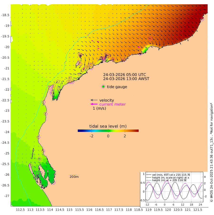 4cm/s 30T +12cm/s rms + 5cm/s -173T. NWSBAR 206m 8cm/s 40T +22cm/s rms + 10cm/s -148T. TAN100 109m 11cm/s 105T +11cm/s rms + 8cm/s -129T. PIL200 208m 18cm/s 115T +13cm/s rms + 7cm/s -137T. PIL100 105m 22cm/s 117T +12cm/s rms + 2cm/s -92T. PIL050 55m 7cm/s 44T +18cm/s rms + 4cm/s -149T. NRSNIN 61m 27cm/s 111T +6cm/s rms + 3cm/s 112T. NW Shelf M6 65m 47cm Withnell Point 32cm Denham 31cm Shark Bay (Inr Bn) 34cm Shark Bay 21cm Useless Loop -15cm Hamelin Pool 70cm Carnarvon 65cm Cape Cuvier 70cm Coral Bay 70cm Norwegian Bay 114cm Badjirrajirra 77cm Tantabiddi 93cm Point Murat 104cm Exmouth 114cm Learmonth 106cm Y Island 90cm North Muiron Island 102cm Roller 107cm Ashburton North 112cm Onslow (Beadon Creek) 110cm Thevenard Island 113cm Large Island 160cm North Sandy Island 138cm Barrow Island (Wapet Landing) 153cm Barrow Island (Tanker Mooring) 188cm Withnell Bay 131cm Trimouille Island 121cm North West Island 121cm Fortescue Road 188cm Steamboat Island 166cm Sholl Island 184cm Fairway Beacon 189cm Mawby Island 188cm Dampier (King Bay) 192cm Cape Legendre 190cm Hauy Island 222cm Port Walcott (Cape Lambert) 235cm Depuch Island 269cm Port Hedland 268cm Bedout Island 304cm Lagrange Bay