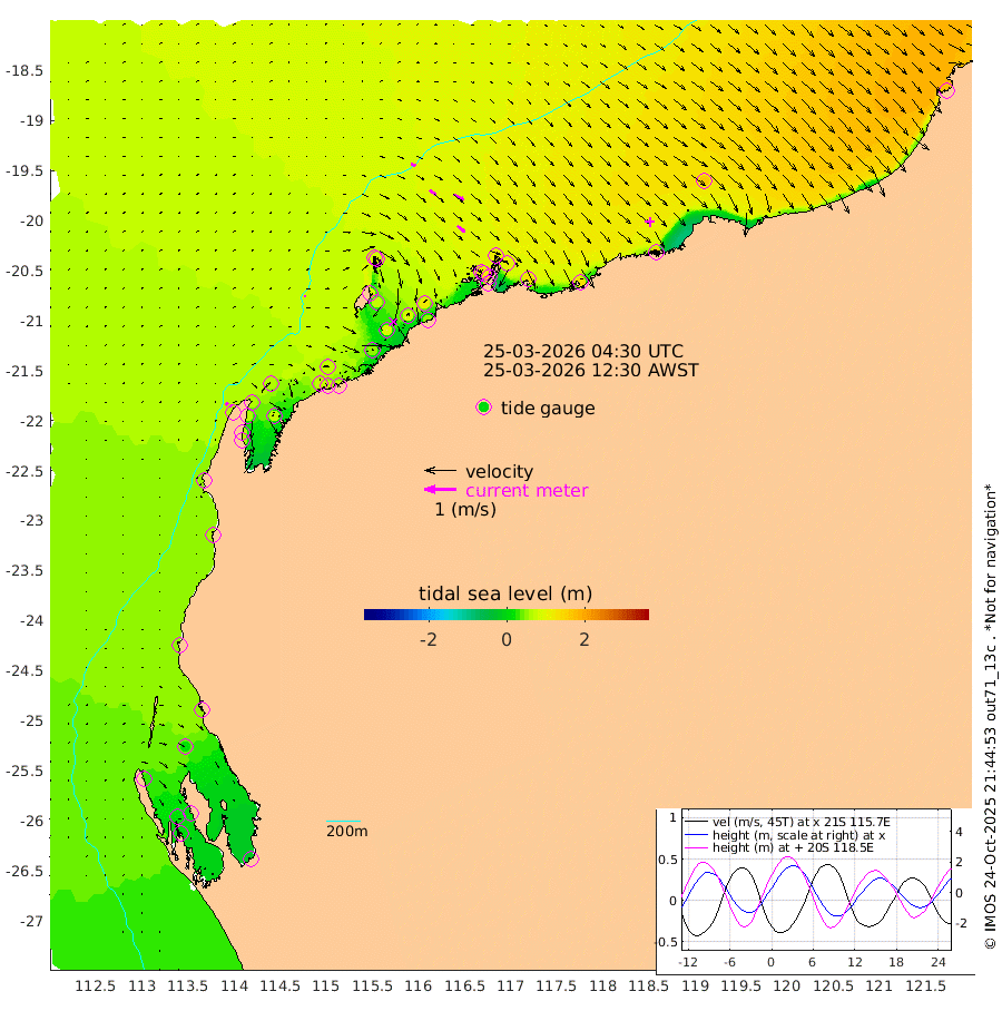6cm/s 66T +12cm/s rms + 5cm/s -173T. NWSBAR 206m 10cm/s 40T +22cm/s rms + 10cm/s -148T. TAN100 109m 15cm/s 108T +11cm/s rms + 8cm/s -129T. PIL200 208m 25cm/s 123T +13cm/s rms + 7cm/s -137T. PIL100 105m 30cm/s 126T +12cm/s rms + 2cm/s -92T. PIL050 55m 10cm/s 46T +18cm/s rms + 4cm/s -149T. NRSNIN 61m 34cm/s 120T +6cm/s rms + 3cm/s 112T. NW Shelf M6 65m 33cm Withnell Point 17cm Denham 16cm Shark Bay (Inr Bn) 20cm Shark Bay 9cm Useless Loop -12cm Hamelin Pool 50cm Carnarvon 56cm Cape Cuvier 59cm Coral Bay 56cm Norwegian Bay 65cm Badjirrajirra 61cm Tantabiddi 61cm Point Murat 62cm Exmouth 66cm Learmonth 69cm Y Island 65cm North Muiron Island 72cm Roller 74cm Ashburton North 74cm Onslow (Beadon Creek) 76cm Thevenard Island 55cm Large Island 85cm North Sandy Island 83cm Barrow Island (Wapet Landing) 76cm Barrow Island (Tanker Mooring) 114cm Withnell Bay 77cm Trimouille Island 83cm North West Island 50cm Fortescue Road 114cm Steamboat Island 87cm Sholl Island 110cm Fairway Beacon 116cm Mawby Island 114cm Dampier (King Bay) 115cm Cape Legendre 103cm Hauy Island 126cm Port Walcott (Cape Lambert) 130cm Depuch Island 151cm Port Hedland 160cm Bedout Island 176cm Lagrange Bay