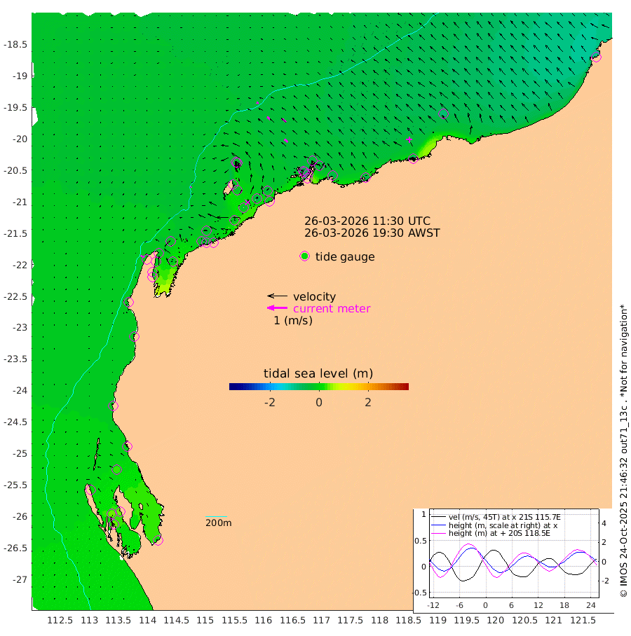 5cm/s -133T +12cm/s rms + 5cm/s -173T. NWSBAR 206m 8cm/s -137T +22cm/s rms + 10cm/s -148T. TAN100 109m 11cm/s -74T +11cm/s rms + 8cm/s -129T. PIL200 208m 19cm/s -52T +13cm/s rms + 7cm/s -137T. PIL100 105m 21cm/s -49T +12cm/s rms + 2cm/s -92T. PIL050 55m 8cm/s -131T +18cm/s rms + 4cm/s -149T. NRSNIN 61m 27cm/s -49T +6cm/s rms + 3cm/s 112T. NW Shelf M6 65m 13cm Withnell Point 36cm Denham 36cm Shark Bay (Inr Bn) 33cm Shark Bay 44cm Useless Loop 12cm Hamelin Pool -2cm Carnarvon -14cm Cape Cuvier -16cm Coral Bay -15cm Norwegian Bay -13cm Badjirrajirra -17cm Tantabiddi -13cm Point Murat -12cm Exmouth -16cm Learmonth -18cm Y Island -18cm North Muiron Island -23cm Roller -23cm Ashburton North -21cm Onslow (Beadon Creek) -24cm Thevenard Island -12cm Large Island -31cm North Sandy Island -27cm Barrow Island (Wapet Landing) -20cm Barrow Island (Tanker Mooring) -47cm Withnell Bay -32cm Trimouille Island -23cm North West Island -12cm Fortescue Road -44cm Steamboat Island -46cm Sholl Island -45cm Fairway Beacon -48cm Mawby Island -47cm Dampier (King Bay) -43cm Cape Legendre -41cm Hauy Island -54cm Port Walcott (Cape Lambert) -53cm Depuch Island -70cm Port Hedland -81cm Bedout Island -97cm Lagrange Bay