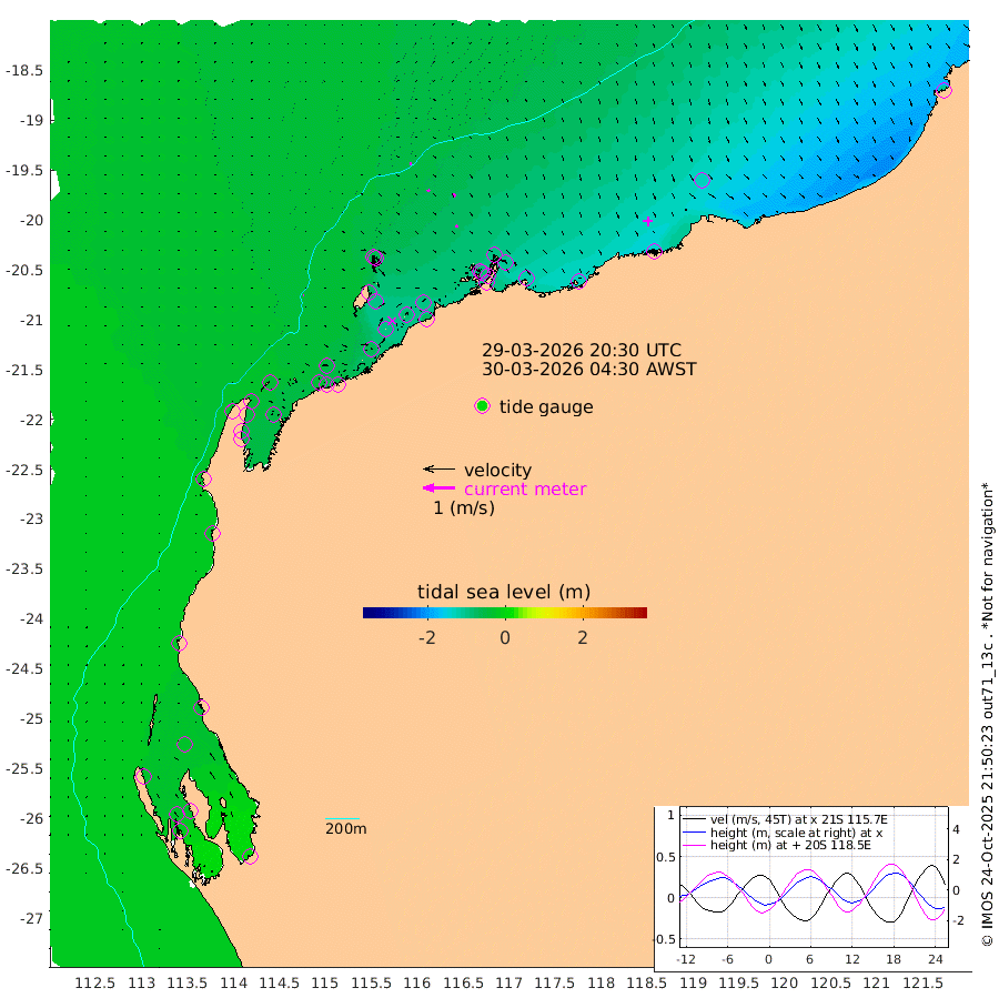 3cm/s 80T +12cm/s rms + 5cm/s -173T. NWSBAR 206m 0cm/s 78T +22cm/s rms + 10cm/s -148T. TAN100 109m 4cm/s 100T +11cm/s rms + 8cm/s -129T. PIL200 208m 7cm/s 137T +13cm/s rms + 7cm/s -137T. PIL100 105m 7cm/s 147T +12cm/s rms + 2cm/s -92T. PIL050 55m 1cm/s 138T +18cm/s rms + 4cm/s -149T. NRSNIN 61m 11cm/s 136T +6cm/s rms + 3cm/s 112T. NW Shelf M6 65m -28cm Withnell Point -28cm Denham -25cm Shark Bay (Inr Bn) -30cm Shark Bay -19cm Useless Loop 11cm Hamelin Pool -36cm Carnarvon -24cm Cape Cuvier -24cm Coral Bay -23cm Norwegian Bay -58cm Badjirrajirra -29cm Tantabiddi -45cm Point Murat -53cm Exmouth -57cm Learmonth -46cm Y Island -36cm North Muiron Island -41cm Roller -46cm Ashburton North -51cm Onslow (Beadon Creek) -48cm Thevenard Island -63cm Large Island -95cm North Sandy Island -68cm Barrow Island (Wapet Landing) -92cm Barrow Island (Tanker Mooring) -90cm Withnell Bay -64cm Trimouille Island -57cm North West Island -68cm Fortescue Road -91cm Steamboat Island -83cm Sholl Island -89cm Fairway Beacon -89cm Mawby Island -91cm Dampier (King Bay) -92cm Cape Legendre -102cm Hauy Island -114cm Port Walcott (Cape Lambert) -133cm Depuch Island -137cm Port Hedland -132cm Bedout Island -102cm Lagrange Bay