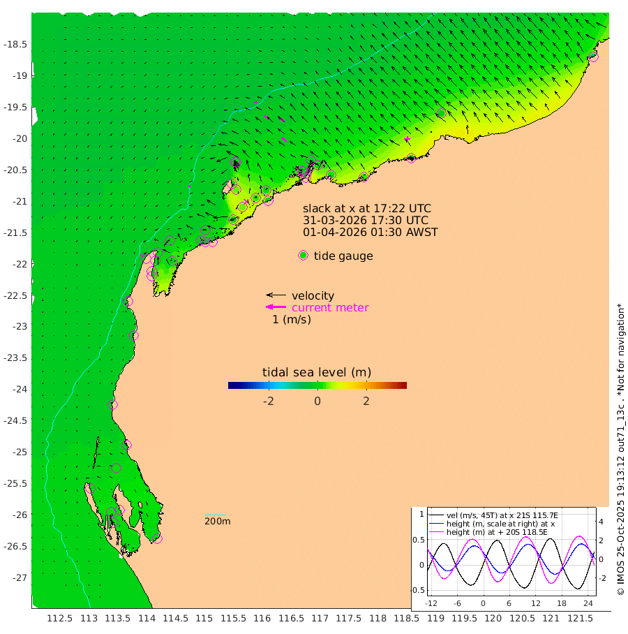 9cm/s -114T +12cm/s rms + 5cm/s -173T. NWSBAR 206m 9cm/s -136T +22cm/s rms + 10cm/s -148T. TAN100 109m 16cm/s -69T +11cm/s rms + 8cm/s -129T. PIL200 208m 27cm/s -52T +13cm/s rms + 7cm/s -137T. PIL100 105m 32cm/s -48T +12cm/s rms + 2cm/s -92T. PIL050 55m 10cm/s -132T +18cm/s rms + 4cm/s -149T. NRSNIN 61m 30cm/s -53T +6cm/s rms + 3cm/s 112T. NW Shelf M6 65m 7cm Withnell Point 18cm Denham 18cm Shark Bay (Inr Bn) 14cm Shark Bay 15cm Useless Loop 2cm Hamelin Pool -2cm Carnarvon -15cm Cape Cuvier -17cm Coral Bay -17cm Norwegian Bay 14cm Badjirrajirra -14cm Tantabiddi 2cm Point Murat 10cm Exmouth 20cm Learmonth -3cm Y Island -10cm North Muiron Island -6cm Roller -9cm Ashburton North -3cm Onslow (Beadon Creek) -8cm Thevenard Island 11cm Large Island 36cm North Sandy Island 6cm Barrow Island (Wapet Landing) 38cm Barrow Island (Tanker Mooring) 1cm Withnell Bay 14cm Trimouille Island -1cm North West Island -3cm Fortescue Road 11cm Steamboat Island 33cm Sholl Island 4cm Fairway Beacon 3cm Mawby Island 1cm Dampier (King Bay) -3cm Cape Legendre 19cm Hauy Island 15cm Port Walcott (Cape Lambert) 28cm Depuch Island 19cm Port Hedland -11cm Bedout Island -88cm Lagrange Bay