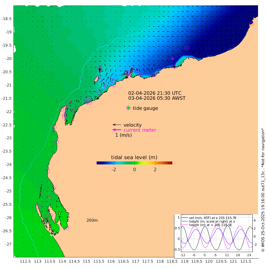 4cm/s 160T +12cm/s rms + 5cm/s -173T. NWSBAR 206m 3cm/s -133T +22cm/s rms + 10cm/s -148T. TAN100 109m 4cm/s -64T +11cm/s rms + 8cm/s -129T. PIL200 208m 8cm/s -70T +13cm/s rms + 7cm/s -137T. PIL100 105m 11cm/s -73T +12cm/s rms + 2cm/s -92T. PIL050 55m 2cm/s -147T +18cm/s rms + 4cm/s -149T. NRSNIN 61m 11cm/s -89T +6cm/s rms + 3cm/s 112T. NW Shelf M6 65m -15cm Withnell Point -10cm Denham -7cm Shark Bay (Inr Bn) -11cm Shark Bay -3cm Useless Loop 9cm Hamelin Pool -35cm Carnarvon -27cm Cape Cuvier -31cm Coral Bay -33cm Norwegian Bay -91cm Badjirrajirra -42cm Tantabiddi -66cm Point Murat -80cm Exmouth -92cm Learmonth -78cm Y Island -57cm North Muiron Island -69cm Roller -78cm Ashburton North -85cm Onslow (Beadon Creek) -81cm Thevenard Island -115cm Large Island -154cm North Sandy Island -118cm Barrow Island (Wapet Landing) -149cm Barrow Island (Tanker Mooring) -174cm Withnell Bay -108cm Trimouille Island -96cm North West Island -146cm Fortescue Road -169cm Steamboat Island -161cm Sholl Island -170cm Fairway Beacon -172cm Mawby Island -175cm Dampier (King Bay) -171cm Cape Legendre -190cm Hauy Island -220cm Port Walcott (Cape Lambert) -242cm Depuch Island -276cm Port Hedland -281cm Bedout Island -338cm Lagrange Bay