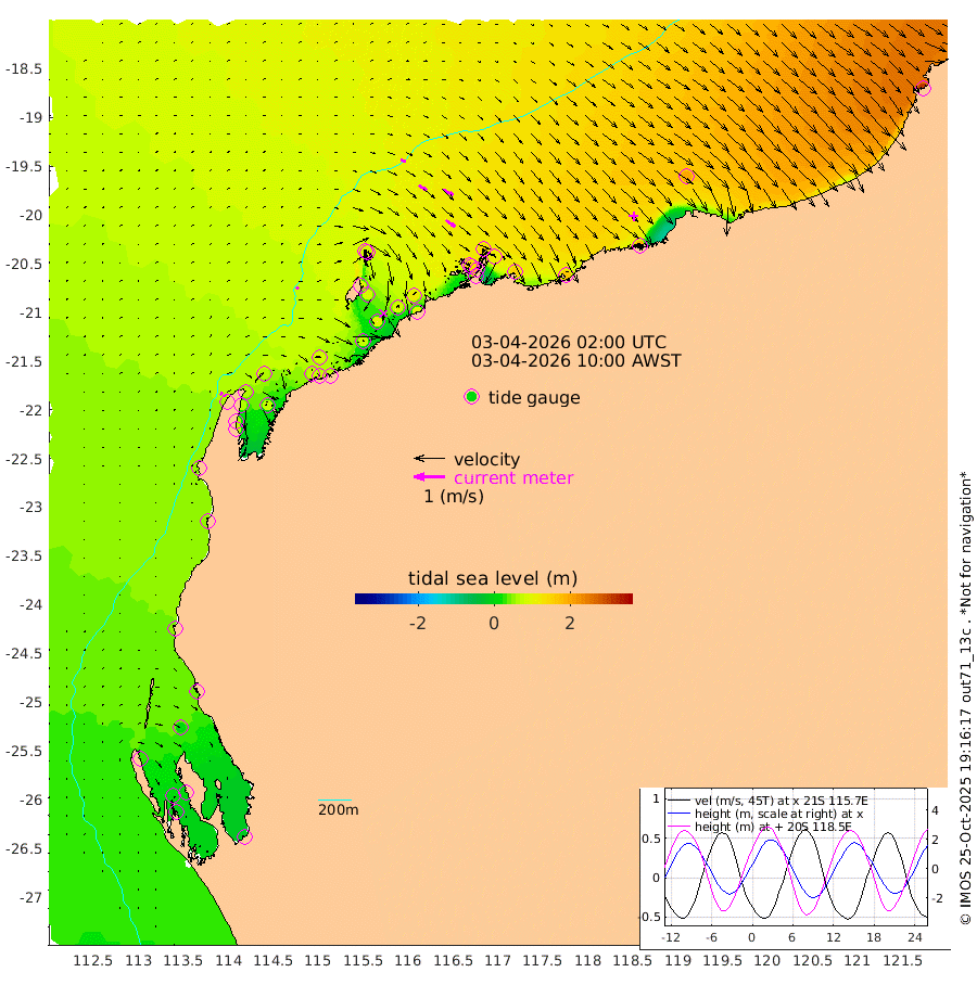 7cm/s 49T +12cm/s rms + 5cm/s -173T. NWSBAR 206m 11cm/s 41T +22cm/s rms + 10cm/s -148T. TAN100 109m 17cm/s 108T +11cm/s rms + 8cm/s -129T. PIL200 208m 31cm/s 123T +13cm/s rms + 7cm/s -137T. PIL100 105m 36cm/s 125T +12cm/s rms + 2cm/s -92T. PIL050 55m 11cm/s 47T +18cm/s rms + 4cm/s -149T. NRSNIN 61m 38cm/s 119T +6cm/s rms + 3cm/s 112T. NW Shelf M6 65m 26cm Withnell Point 6cm Denham 6cm Shark Bay (Inr Bn) 8cm Shark Bay -2cm Useless Loop -12cm Hamelin Pool 45cm Carnarvon 49cm Cape Cuvier 54cm Coral Bay 54cm Norwegian Bay 65cm Badjirrajirra 58cm Tantabiddi 59cm Point Murat 61cm Exmouth 69cm Learmonth 71cm Y Island 64cm North Muiron Island 73cm Roller 78cm Ashburton North 77cm Onslow (Beadon Creek) 79cm Thevenard Island 73cm Large Island 92cm North Sandy Island 92cm Barrow Island (Wapet Landing) 83cm Barrow Island (Tanker Mooring) 136cm Withnell Bay 82cm Trimouille Island 84cm North West Island 93cm Fortescue Road 117cm Steamboat Island 89cm Sholl Island 131cm Fairway Beacon 136cm Mawby Island 135cm Dampier (King Bay) 140cm Cape Legendre 124cm Hauy Island 153cm Port Walcott (Cape Lambert) 164cm Depuch Island 188cm Port Hedland 200cm Bedout Island 314cm Lagrange Bay