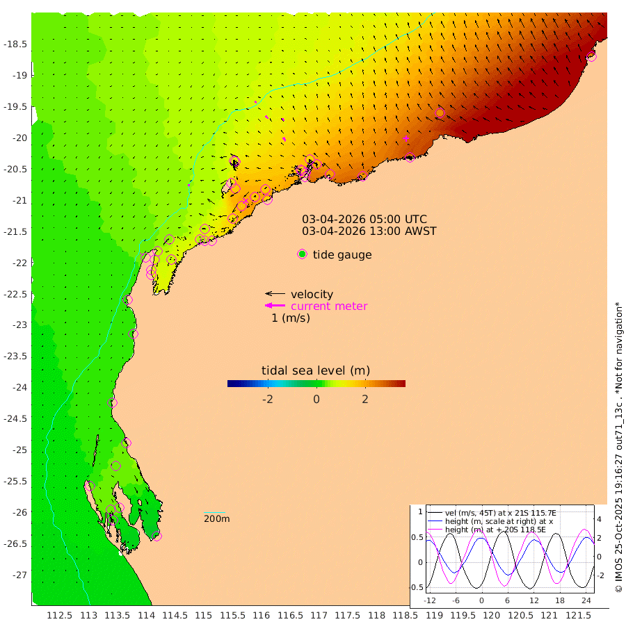 10cm/s -93T +12cm/s rms + 5cm/s -173T. NWSBAR 206m 4cm/s -136T +22cm/s rms + 10cm/s -148T. TAN100 109m 10cm/s -72T +11cm/s rms + 8cm/s -129T. PIL200 208m 18cm/s -41T +13cm/s rms + 7cm/s -137T. PIL100 105m 20cm/s -34T +12cm/s rms + 2cm/s -92T. PIL050 55m 5cm/s -126T +18cm/s rms + 4cm/s -149T. NRSNIN 61m 17cm/s -25T +6cm/s rms + 3cm/s 112T. NW Shelf M6 65m 34cm Withnell Point 38cm Denham 35cm Shark Bay (Inr Bn) 36cm Shark Bay 28cm Useless Loop -9cm Hamelin Pool 46cm Carnarvon 26cm Cape Cuvier 28cm Coral Bay 30cm Norwegian Bay 104cm Badjirrajirra 37cm Tantabiddi 71cm Point Murat 90cm Exmouth 106cm Learmonth 78cm Y Island 54cm North Muiron Island 65cm Roller 72cm Ashburton North 83cm Onslow (Beadon Creek) 75cm Thevenard Island 133cm Large Island 169cm North Sandy Island 117cm Barrow Island (Wapet Landing) 168cm Barrow Island (Tanker Mooring) 156cm Withnell Bay 111cm Trimouille Island 90cm North West Island 152cm Fortescue Road 158cm Steamboat Island 165cm Sholl Island 155cm Fairway Beacon 155cm Mawby Island 157cm Dampier (King Bay) 155cm Cape Legendre 181cm Hauy Island 203cm Port Walcott (Cape Lambert) 224cm Depuch Island 250cm Port Hedland 227cm Bedout Island 239cm Lagrange Bay