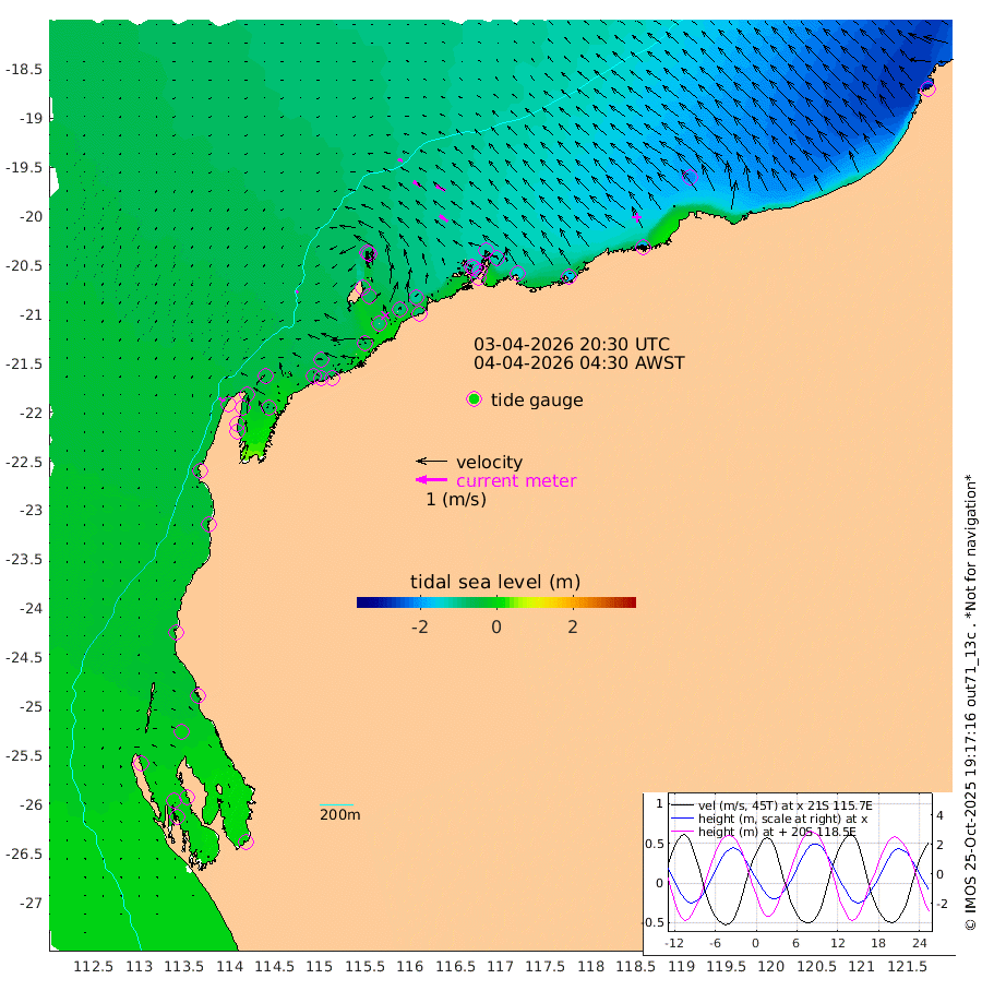 7cm/s -137T +12cm/s rms + 5cm/s -173T. NWSBAR 206m 8cm/s -139T +22cm/s rms + 10cm/s -148T. TAN100 109m 16cm/s -71T +11cm/s rms + 8cm/s -129T. PIL200 208m 27cm/s -56T +13cm/s rms + 7cm/s -137T. PIL100 105m 33cm/s -54T +12cm/s rms + 2cm/s -92T. PIL050 55m 8cm/s -134T +18cm/s rms + 4cm/s -149T. NRSNIN 61m 33cm/s -63T +6cm/s rms + 3cm/s 112T. NW Shelf M6 65m -7cm Withnell Point 1cm Denham 1cm Shark Bay (Inr Bn) -1cm Shark Bay 1cm Useless Loop 1cm Hamelin Pool -23cm Carnarvon -28cm Cape Cuvier -33cm Coral Bay -33cm Norwegian Bay -51cm Badjirrajirra -39cm Tantabiddi -43cm Point Murat -46cm Exmouth -51cm Learmonth -57cm Y Island -47cm North Muiron Island -55cm Roller -61cm Ashburton North -61cm Onslow (Beadon Creek) -62cm Thevenard Island -59cm Large Island -81cm North Sandy Island -77cm Barrow Island (Wapet Landing) -73cm Barrow Island (Tanker Mooring) -123cm Withnell Bay -62cm Trimouille Island -71cm North West Island -87cm Fortescue Road -112cm Steamboat Island -85cm Sholl Island -118cm Fairway Beacon -123cm Mawby Island -123cm Dampier (King Bay) -121cm Cape Legendre -118cm Hauy Island -145cm Port Walcott (Cape Lambert) -159cm Depuch Island -185cm Port Hedland -209cm Bedout Island -306cm Lagrange Bay