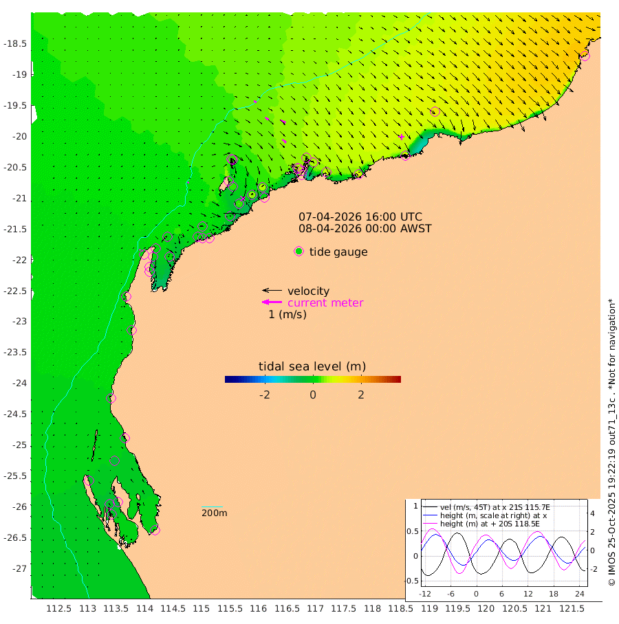 6cm/s 45T +12cm/s rms + 5cm/s -173T. NWSBAR 206m 6cm/s 42T +22cm/s rms + 10cm/s -148T. TAN100 109m 13cm/s 107T +11cm/s rms + 8cm/s -129T. PIL200 208m 21cm/s 127T +13cm/s rms + 7cm/s -137T. PIL100 105m 25cm/s 130T +12cm/s rms + 2cm/s -92T. PIL050 55m 5cm/s 49T +18cm/s rms + 4cm/s -149T. NRSNIN 61m 28cm/s 121T +6cm/s rms + 3cm/s 112T. NW Shelf M6 65m -22cm Withnell Point -35cm Denham -33cm Shark Bay (Inr Bn) -35cm Shark Bay -34cm Useless Loop 2cm Hamelin Pool -13cm Carnarvon -3cm Cape Cuvier 0cm Coral Bay 0cm Norwegian Bay 8cm Badjirrajirra 5cm Tantabiddi 4cm Point Murat 6cm Exmouth 12cm Learmonth 15cm Y Island 10cm North Muiron Island 19cm Roller 17cm Ashburton North 18cm Onslow (Beadon Creek) 18cm Thevenard Island -9cm Large Island 31cm North Sandy Island 27cm Barrow Island (Wapet Landing) 24cm Barrow Island (Tanker Mooring) 61cm Withnell Bay 23cm Trimouille Island 25cm North West Island 7cm Fortescue Road 59cm Steamboat Island 45cm Sholl Island 58cm Fairway Beacon 64cm Mawby Island 60cm Dampier (King Bay) 56cm Cape Legendre 60cm Hauy Island 75cm Port Walcott (Cape Lambert) 92cm Depuch Island 104cm Port Hedland 118cm Bedout Island 168cm Lagrange Bay