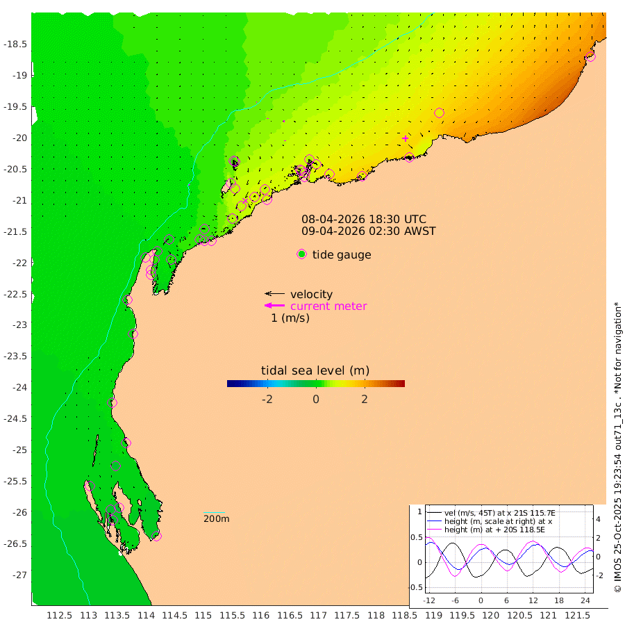 4cm/s -45T +12cm/s rms + 5cm/s -173T. NWSBAR 206m 0cm/s 83T +22cm/s rms + 10cm/s -148T. TAN100 109m 2cm/s 58T +11cm/s rms + 8cm/s -129T. PIL200 208m 2cm/s 6T +13cm/s rms + 7cm/s -137T. PIL100 105m 3cm/s 2T +12cm/s rms + 2cm/s -92T. PIL050 55m 0cm/s 110T +18cm/s rms + 4cm/s -149T. NRSNIN 61m 6cm/s 78T +6cm/s rms + 3cm/s 112T. NW Shelf M6 65m -12cm Withnell Point -25cm Denham -26cm Shark Bay (Inr Bn) -27cm Shark Bay -31cm Useless Loop -8cm Hamelin Pool 0cm Carnarvon -2cm Cape Cuvier 0cm Coral Bay 4cm Norwegian Bay 35cm Badjirrajirra 5cm Tantabiddi 19cm Point Murat 28cm Exmouth 39cm Learmonth 28cm Y Island 15cm North Muiron Island 25cm Roller 24cm Ashburton North 28cm Onslow (Beadon Creek) 25cm Thevenard Island 61cm Large Island 73cm North Sandy Island 45cm Barrow Island (Wapet Landing) 69cm Barrow Island (Tanker Mooring) 72cm Withnell Bay 43cm Trimouille Island 30cm North West Island 82cm Fortescue Road 71cm Steamboat Island 84cm Sholl Island 72cm Fairway Beacon 74cm Mawby Island 72cm Dampier (King Bay) 67cm Cape Legendre 87cm Hauy Island 97cm Port Walcott (Cape Lambert) 111cm Depuch Island 126cm Port Hedland 111cm Bedout Island 212cm Lagrange Bay