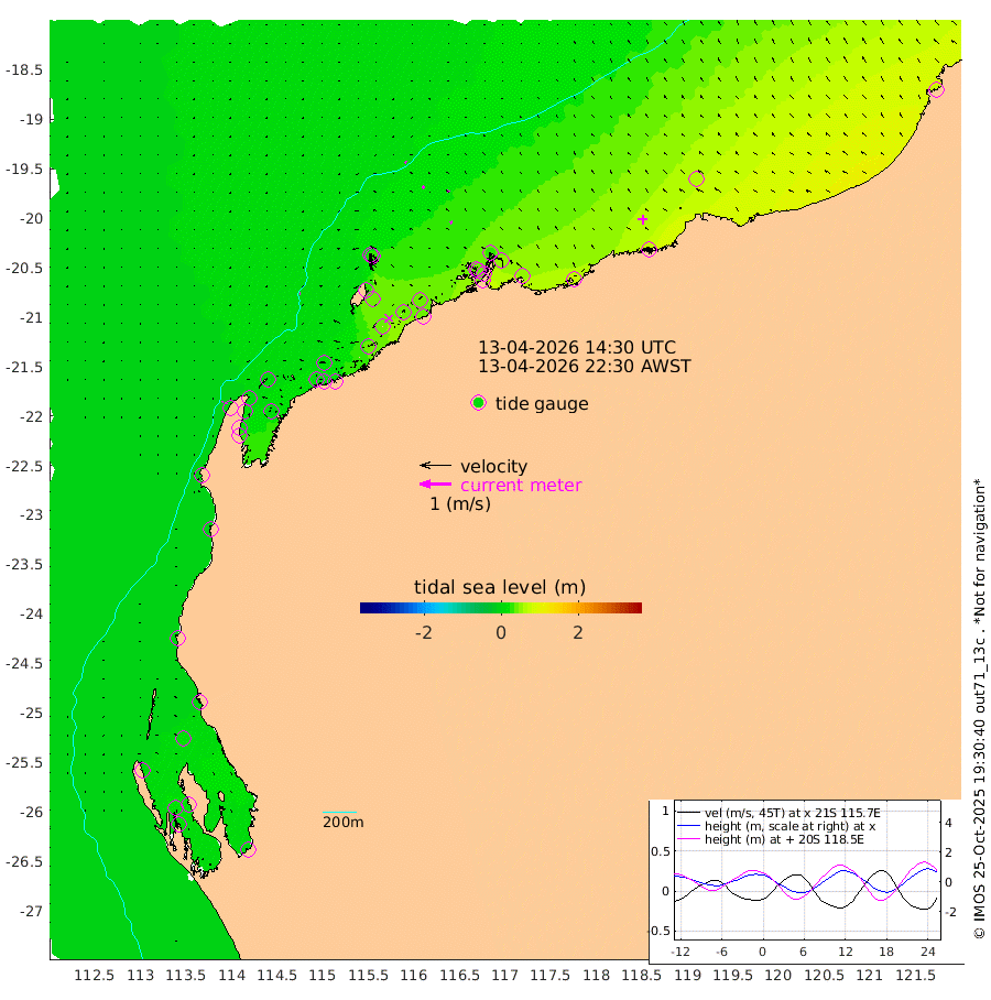 3cm/s -95T +12cm/s rms + 5cm/s -173T. NWSBAR 206m 3cm/s -139T +22cm/s rms + 10cm/s -148T. TAN100 109m 4cm/s -66T +11cm/s rms + 8cm/s -129T. PIL200 208m 7cm/s -45T +13cm/s rms + 7cm/s -137T. PIL100 105m 7cm/s -36T +12cm/s rms + 2cm/s -92T. PIL050 55m 4cm/s -131T +18cm/s rms + 4cm/s -149T. NRSNIN 61m 10cm/s -55T +6cm/s rms + 3cm/s 112T. NW Shelf M6 65m 6cm Withnell Point 14cm Denham 14cm Shark Bay (Inr Bn) 13cm Shark Bay 15cm Useless Loop 2cm Hamelin Pool 3cm Carnarvon -4cm Cape Cuvier -3cm Coral Bay -4cm Norwegian Bay 18cm Badjirrajirra 1cm Tantabiddi 10cm Point Murat 15cm Exmouth 24cm Learmonth 11cm Y Island 6cm North Muiron Island 9cm Roller 11cm Ashburton North 13cm Onslow (Beadon Creek) 12cm Thevenard Island 35cm Large Island 41cm North Sandy Island 24cm Barrow Island (Wapet Landing) 40cm Barrow Island (Tanker Mooring) 37cm Withnell Bay 28cm Trimouille Island 21cm North West Island 38cm Fortescue Road 35cm Steamboat Island 35cm Sholl Island 35cm Fairway Beacon 34cm Mawby Island 37cm Dampier (King Bay) 31cm Cape Legendre 46cm Hauy Island 52cm Port Walcott (Cape Lambert) 72cm Depuch Island 68cm Port Hedland 60cm Bedout Island 71cm Lagrange Bay