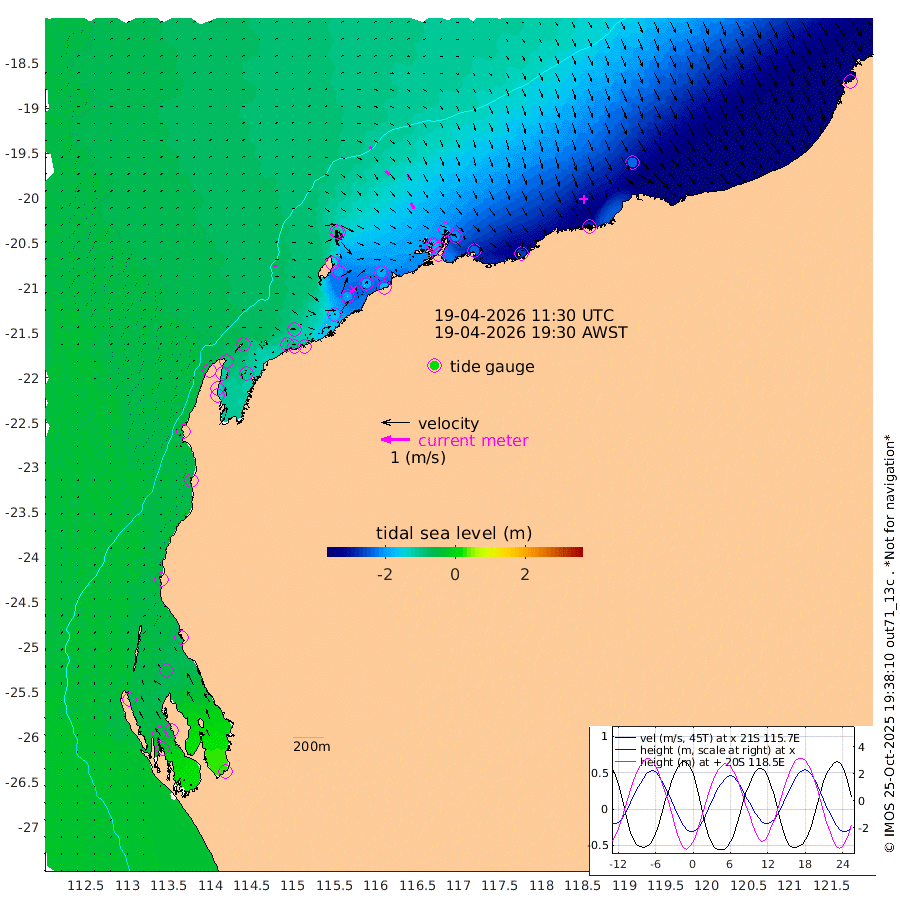 12cm/s 85T +12cm/s rms + 5cm/s -173T. NWSBAR 206m 2cm/s 48T +22cm/s rms + 10cm/s -148T. TAN100 109m 11cm/s 112T +11cm/s rms + 8cm/s -129T. PIL200 208m 19cm/s 139T +13cm/s rms + 7cm/s -137T. PIL100 105m 24cm/s 146T +12cm/s rms + 2cm/s -92T. PIL050 55m 3cm/s 63T +18cm/s rms + 4cm/s -149T. NRSNIN 61m 17cm/s 159T +6cm/s rms + 3cm/s 112T. NW Shelf M6 65m -57cm Withnell Point -47cm Denham -41cm Shark Bay (Inr Bn) -46cm Shark Bay -25cm Useless Loop 25cm Hamelin Pool -75cm Carnarvon -50cm Cape Cuvier -51cm Coral Bay -55cm Norwegian Bay -130cm Badjirrajirra -60cm Tantabiddi -96cm Point Murat -116cm Exmouth -131cm Learmonth -104cm Y Island -78cm North Muiron Island -93cm Roller -95cm Ashburton North -106cm Onslow (Beadon Creek) -99cm Thevenard Island -168cm Large Island -200cm North Sandy Island -141cm Barrow Island (Wapet Landing) -199cm Barrow Island (Tanker Mooring) -179cm Withnell Bay -140cm Trimouille Island -112cm North West Island -180cm Fortescue Road -187cm Steamboat Island -188cm Sholl Island -179cm Fairway Beacon -179cm Mawby Island -180cm Dampier (King Bay) -180cm Cape Legendre -207cm Hauy Island -226cm Port Walcott (Cape Lambert) -260cm Depuch Island -271cm Port Hedland -228cm Bedout Island -306cm Lagrange Bay