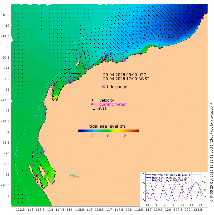 9cm/s -144T +12cm/s rms + 5cm/s -173T. NWSBAR 206m 14cm/s -138T +22cm/s rms + 10cm/s -148T. TAN100 109m 21cm/s -75T +11cm/s rms + 8cm/s -129T. PIL200 208m 35cm/s -57T +13cm/s rms + 7cm/s -137T. PIL100 105m 41cm/s -55T +12cm/s rms + 2cm/s -92T. PIL050 55m 14cm/s -133T +18cm/s rms + 4cm/s -149T. NRSNIN 61m 45cm/s -56T +6cm/s rms + 3cm/s 112T. NW Shelf M6 65m -18cm Withnell Point 20cm Denham 21cm Shark Bay (Inr Bn) 16cm Shark Bay 35cm Useless Loop 25cm Hamelin Pool -48cm Carnarvon -57cm Cape Cuvier -60cm Coral Bay -60cm Norwegian Bay -76cm Badjirrajirra -66cm Tantabiddi -67cm Point Murat -70cm Exmouth -80cm Learmonth -78cm Y Island -71cm North Muiron Island -84cm Roller -87cm Ashburton North -88cm Onslow (Beadon Creek) -90cm Thevenard Island -49cm Large Island -112cm North Sandy Island -105cm Barrow Island (Wapet Landing) -101cm Barrow Island (Tanker Mooring) -157cm Withnell Bay -102cm Trimouille Island -95cm North West Island -60cm Fortescue Road -148cm Steamboat Island -122cm Sholl Island -152cm Fairway Beacon -159cm Mawby Island -156cm Dampier (King Bay) -164cm Cape Legendre -149cm Hauy Island -179cm Port Walcott (Cape Lambert) -188cm Depuch Island -220cm Port Hedland -225cm Bedout Island -278cm Lagrange Bay