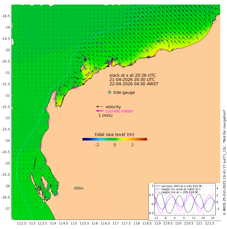 10cm/s -105T +12cm/s rms + 5cm/s -173T. NWSBAR 206m 7cm/s -139T +22cm/s rms + 10cm/s -148T. TAN100 109m 16cm/s -72T +11cm/s rms + 8cm/s -129T. PIL200 208m 27cm/s -53T +13cm/s rms + 7cm/s -137T. PIL100 105m 32cm/s -49T +12cm/s rms + 2cm/s -92T. PIL050 55m 6cm/s -128T +18cm/s rms + 4cm/s -149T. NRSNIN 61m 36cm/s -54T +6cm/s rms + 3cm/s 112T. NW Shelf M6 65m -1cm Withnell Point -5cm Denham -10cm Shark Bay (Inr Bn) -8cm Shark Bay -18cm Useless Loop -16cm Hamelin Pool 1cm Carnarvon -12cm Cape Cuvier -15cm Coral Bay -10cm Norwegian Bay 9cm Badjirrajirra -15cm Tantabiddi -1cm Point Murat 5cm Exmouth 9cm Learmonth -7cm Y Island -13cm North Muiron Island -12cm Roller -12cm Ashburton North -9cm Onslow (Beadon Creek) -12cm Thevenard Island 38cm Large Island 25cm North Sandy Island -3cm Barrow Island (Wapet Landing) 28cm Barrow Island (Tanker Mooring) -15cm Withnell Bay 4cm Trimouille Island -16cm North West Island 40cm Fortescue Road -11cm Steamboat Island 20cm Sholl Island -11cm Fairway Beacon -15cm Mawby Island -14cm Dampier (King Bay) -13cm Cape Legendre 5cm Hauy Island -7cm Port Walcott (Cape Lambert) -2cm Depuch Island -12cm Port Hedland -47cm Bedout Island -43cm Lagrange Bay