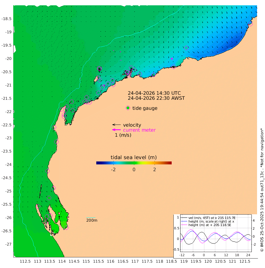 2cm/s 122T +12cm/s rms + 5cm/s -173T. NWSBAR 206m 2cm/s -133T +22cm/s rms + 10cm/s -148T. TAN100 109m 1cm/s 99T +11cm/s rms + 8cm/s -129T. PIL200 208m 3cm/s 153T +13cm/s rms + 7cm/s -137T. PIL100 105m 5cm/s 164T +12cm/s rms + 2cm/s -92T. PIL050 55m 3cm/s -143T +18cm/s rms + 4cm/s -149T. NRSNIN 61m 8cm/s 151T +6cm/s rms + 3cm/s 112T. NW Shelf M6 65m -30cm Withnell Point -17cm Denham -12cm Shark Bay (Inr Bn) -19cm Shark Bay -2cm Useless Loop 21cm Hamelin Pool -47cm Carnarvon -37cm Cape Cuvier -38cm Coral Bay -41cm Norwegian Bay -72cm Badjirrajirra -40cm Tantabiddi -56cm Point Murat -65cm Exmouth -66cm Learmonth -60cm Y Island -47cm North Muiron Island -51cm Roller -57cm Ashburton North -61cm Onslow (Beadon Creek) -59cm Thevenard Island -98cm Large Island -98cm North Sandy Island -76cm Barrow Island (Wapet Landing) -98cm Barrow Island (Tanker Mooring) -92cm Withnell Bay -71cm Trimouille Island -57cm North West Island -109cm Fortescue Road -89cm Steamboat Island -99cm Sholl Island -92cm Fairway Beacon -92cm Mawby Island -94cm Dampier (King Bay) -99cm Cape Legendre -101cm Hauy Island -111cm Port Walcott (Cape Lambert) -105cm Depuch Island -129cm Port Hedland -116cm Bedout Island -153cm Lagrange Bay